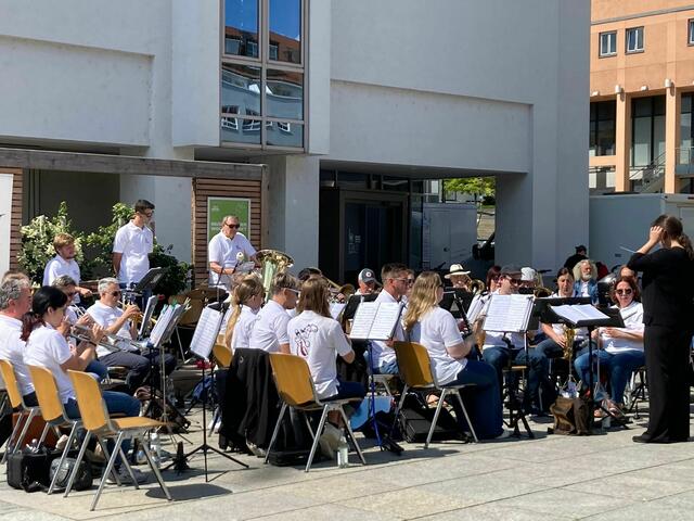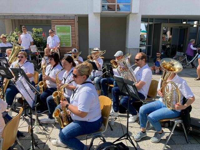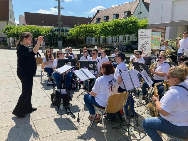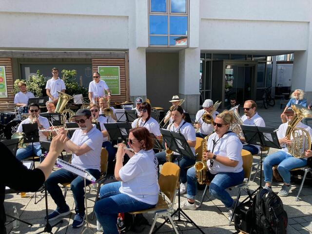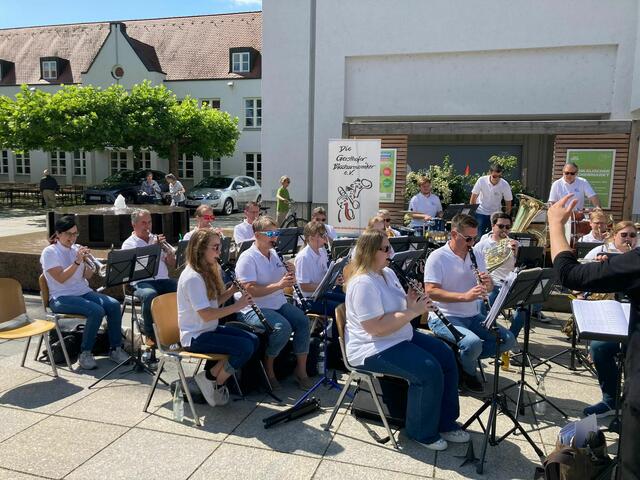 Über die Sommermonate umrahmen Gersthofer Musikgruppen den samstäglichen Wochenmarkt auf dem Rathausplatz. Auch die Blasharmoniker konnten einen Slot ergattern, und so unterhielt das Blasorchester die Einkäufer mit einer bunten Mischung aus traditioneller Blasmusik und moderner Unterhaltungsmusik. Mit im Programm auch ein paar Titel der eben erst gespielten Serenade im Nogent-Park.