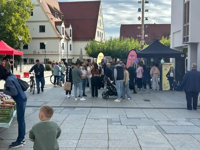 Die Fotos des Tages zeigen einen gut besuchten Rathausplatz, konzentrierte Kinder beim Schminken und mit Klebetatoos, interessierte Bürgerinnen und Bürger im Gespräch sowie fröhliche Momente bei Kaffee und Austausch über die Zukunft Gersthofens.