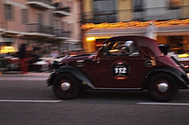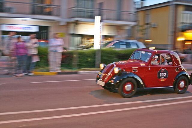 So ging der Fiat Topolino "Mäuschen" dann am 15.Mai auf die Reise von Giessen nach Oberitalien, der Stadt Brescia, die seit jeher Start und Ziel Punkt der Mille Miglia, ist. Mit Fahrer Reinhard Schade und Copilot Robert Faber, sollte dort am 17.Mai zu dem Strassenrennen über 1600km (Mille Miglia= ital., heisst: tausend Meilen = rund 1600km) von Brescia-Rom-Brescia, mit Startnummer 112, gestartet werden. Der Fiat "Mäuschen" der Lebenshilfepiloten, konnte diese Herausforderung ohne grössere Schwierigkeiten, bewältigen. War der kleine Fiat doch, mit nur 13 PS, schwächster Teilnehmer im Feld, avancierte er im Laufe des Rennens zum absoluten Liebling der Massen. Mit tosendem Beifall und fanatischem Jubel, begleiteten die Italiener das Giessener Rennteam bei jeder Ortsdurchfahrt. Sprach es sich doch unter den über 1 Million Zuschauern an der Strecke, schnell herum, das sich das einstige Brot-und- Butter-Auto Italiens, heute wie damals, wieder der übermächtigen Konkurrenz von Ferrari und Jaguar u.a., bei dem traditionellen Rennen quer durch Italien, stellte.