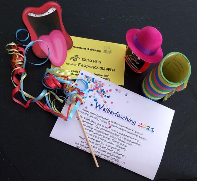 Diese Tradition konnte dieses Jahr leider nicht statt finden, Corona hat den Frauen einen Strich durch die Rechnung gemacht. Die Vorstandschaft wollte aber uns Frauen zeigen, dass wir in einer Gemeinschaft nicht vergessen sind und so bekamen wir ein närrisches Tütchen nach Hause gebracht mit der Aufforderung, heuer den Weiberfasching selbst zusammen zu bauen nach diesem Motto: