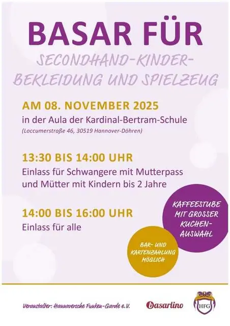 Am Samstag, den 8. November findet in Wülfel der erste Basar für Kindersachen statt. Ab 14:00 Uhr lädt die Hannoversche Funkengarde (HFG) in die Aula der Kardinal-Bertram-Schule in der Loccumer Str. 46 in 30519 Hannover zum stöbern und entdecken von bunter Kleidung, spannender Bücher und lustiger Spiele. Schwangere mit Mutterpass und Mütter mit Kindern bis zwei Jahren können bereit um 13:30 Uhr eintreten. Geboten werden gut erhaltene Baby- und Kinderbekleidung (Größe 50-176), Umstandsmode,...