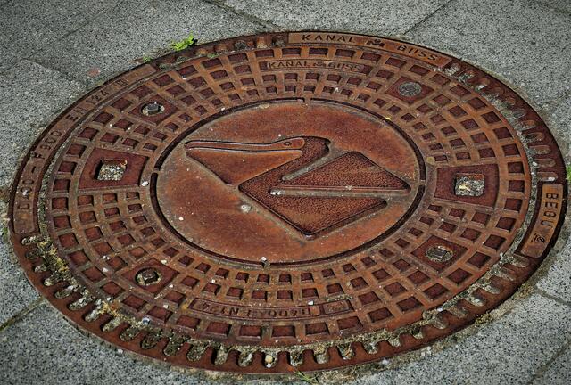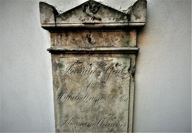 Beim Rundgang um die Gebäude ist auch ein Familiengrabstein der Familie Wagner zu sehen und überall der Pelikan als einer der ältesten Markenzeichen seit 1878 !