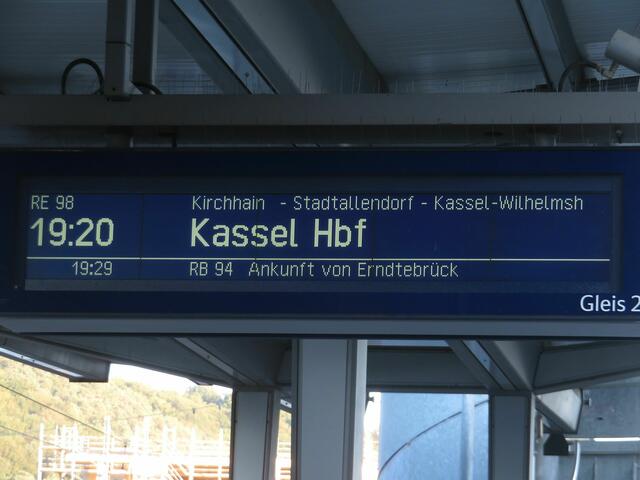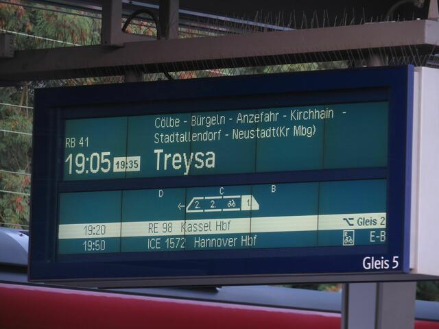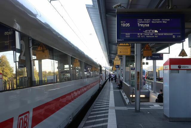 Am 4.10.2023 kam es laut Fahrplanauskunft zu einer Streckensperrung auf der Main-Weser-Bahn wegen "Notarzteinsatz auf der Strecke zwischen Cölbe und Marburg(Lahn)". Das führte zu einem Halt von ICE 799, der aktuell ohne Zwischenhalt über die Main-Weser-Bahn von Kassel-Wilhelmshöhe bis Frankfurt verkehrt. Schon vor seiner Ankunft um etwa 19:10 Uhr stand in Kirchhain auf Gleis 5 ein RE98 nach Frankfurt. Gegen 19:35 fuhr der ICE in Kirchhain ab, etwa 5 Minuten später der RE98 und gegen 19:43 der...