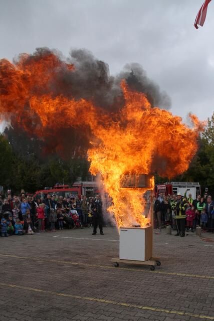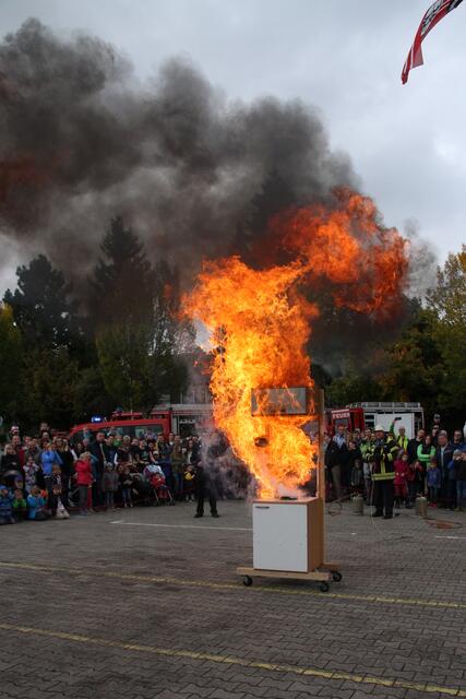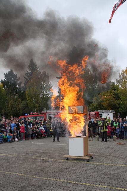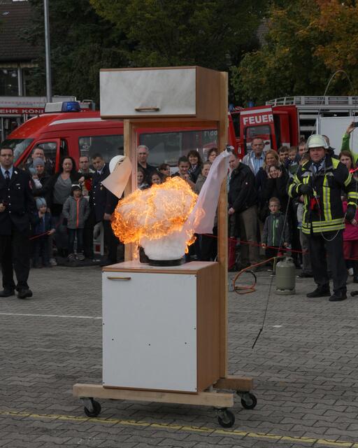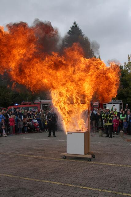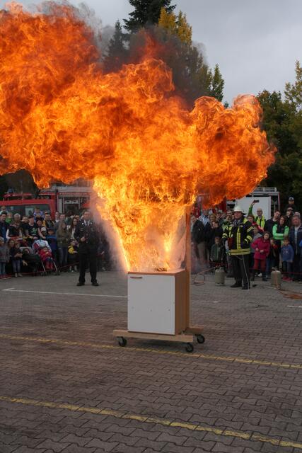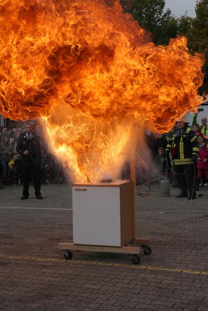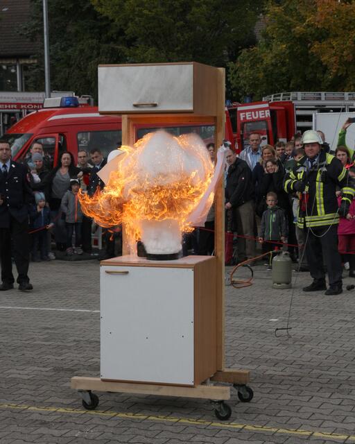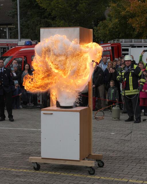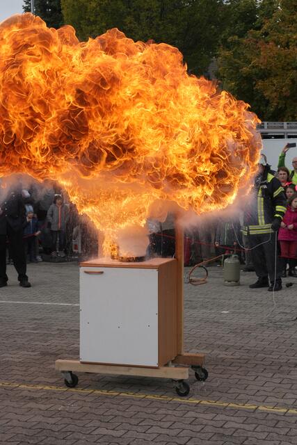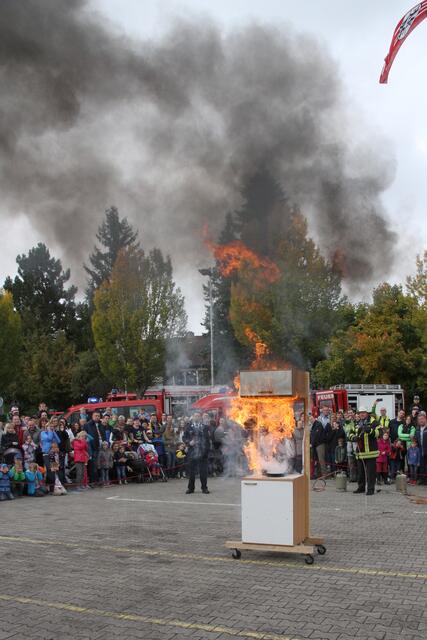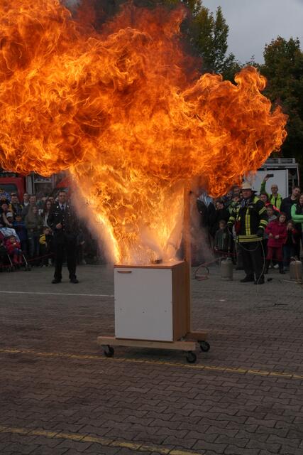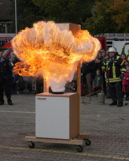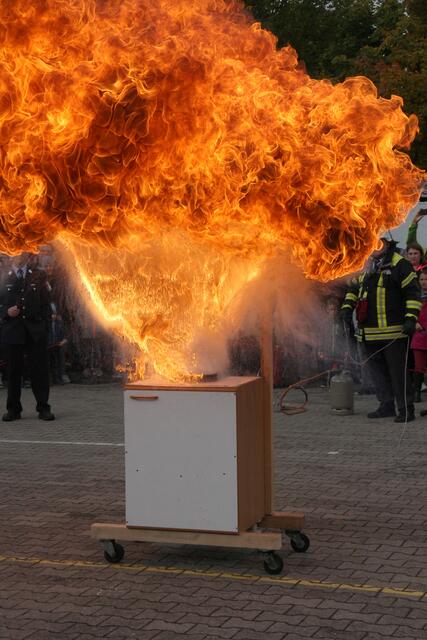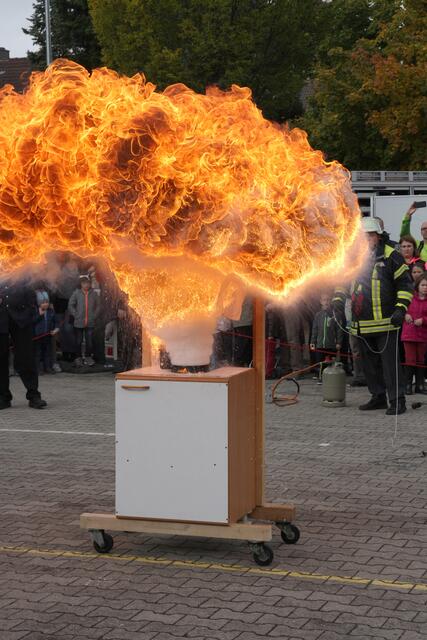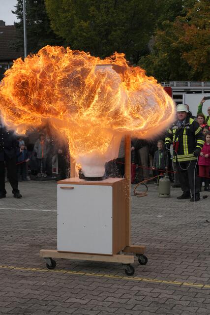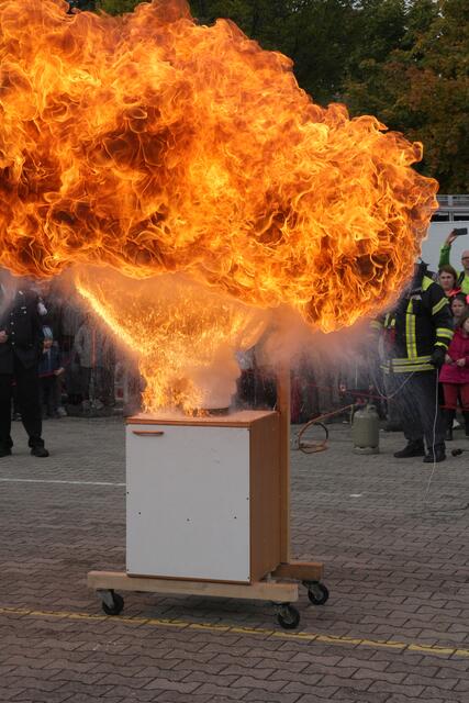 Vorführung einer Fettverbrennung die mit Wasser gelöscht wird (Fettexplosion). Tag der offenen Tür bei der Freiwilligen Feuerwehr Königsbrunn. Die FFW Königsbrunn demonstrierte was passiert wenn brennendes Fett statt mit einer Decke oder einem Deckel mit Wasser gelöscht wird. Die Bildfolge zeigt innerhalb von 3 Sekunden ein Flammeninferno das schwerste Verbrennungen oder sogar den Tod zur Folge haben kann. Eine sehr lehrreiche Demonstration für alle die in der Küche arbeiten. Es ist mir ein...