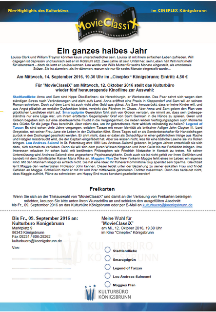 Wenn Sie sich an der Titelauswahl von "MovieClassiX" und damit an der Verlosung von Freikarten beteiligen möchten, geben Sie bitte Ihren Wunschfilm an und schicken uns diesen mit Ihrer Adresse bis Freitag, 05. August 2016 an das Kulturbüro Königsbrunn per E-Mail an kulturbuero@koenigsbrunn.de