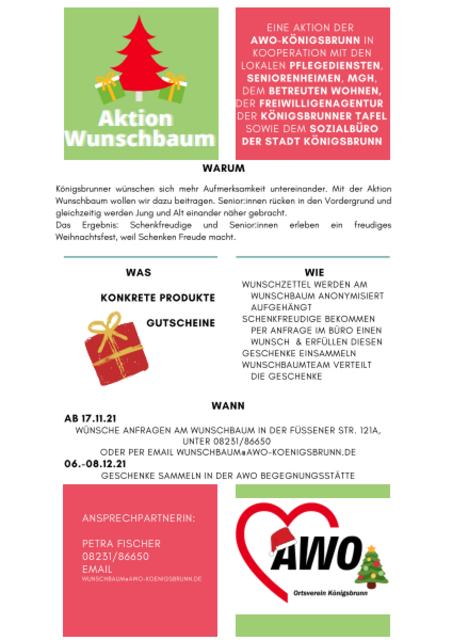Der Wunschbaum ist ab 15.11.21 in der AWO Begegnungsstätte in der Füssener Straße 121A zu finden. Jeder der möchte, kann sich vom Wunschbaum direkt oder als Mitglied der Facebook-Gruppe „Wunschbaum Königsbrunn“ über die Wünsche informieren.