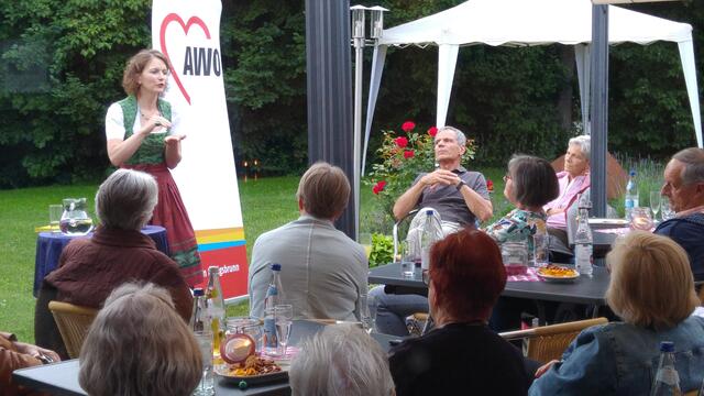 Nach der gelungenen Premiere vor einem Jahr hat der Vorstand des Ortsvereines beschlossen, auch in diesem Jahr einen Märchenabend im Garten der AWO Begegnungsstätte anzubieten. Dass die Idee sehr gut war, hat sich an der Besucherzahl gezeigt. Die Terrasse der Begegnungsstätte war voll besetzt und die Organisatoren mussten zusätzlich Tische und Stühle bereitstellen. Als Märchenerzählerin konnte wieder Frau Hildegard Häfele gewonnen werden. Die unsichere Wetterlage führte bei den Organisatoren zu der wichtigen Entscheidung “drinnen oder draußen“