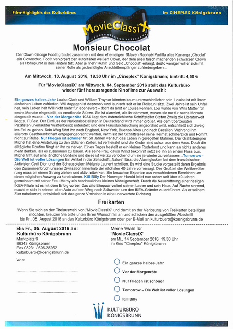 Wenn Sie sich an der Titelauswahl von "MovieClassiX" und damit an der Verlosung von Freikarten beteiligen möchten, geben Sie bitte Ihren Wunschfilm an und schicken uns diesen mit Ihrer Adresse bis Freitag, 05. August 2016 an das Kulturbüro Königsbrunn per E-Mail an kulturbuero@koenigsbrunn.de