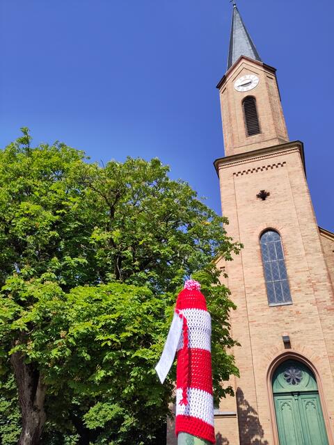 Für sehbehinderte und ältere Menschen ist häufig die Kontrastempfindlichkeit herabgesetzt. Das bedeutet, sie brauchen für ihre visuelle Wahrnehmung verstärkte Kontraste. Darum tragen die grünen Poller vor der Ev. Kirche St. Johannes für eine Woche leuchtend rot-weiß geringelte Mützen. Viele fleißige Hände haben die Pollermützen angefertigt.