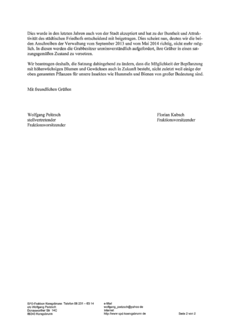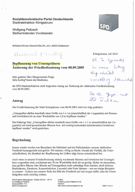 In diesem Jahr wird die Satzung für den städtischen Friedhof überarbeitet. Die SPD-Fraktion hat sich mit drei Anträgen eingebracht. Den vollen Wortlaut kann man den Bildern entnehmen.