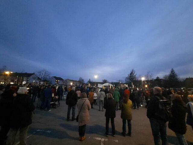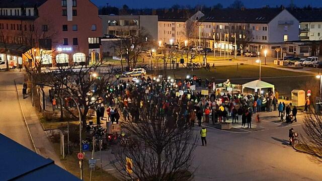 Nach Schätzungen der Veranstalter haben 700 Menschen auf dem Marktplatz in Königsbrunn mit einem "Lichtermeer für Demokratie und Frieden" gegen Rassismus, Antisemitismus und Hetze demonstriert. Einige hatten sich Lichterketten umgehängt, viele kamen mit Lampions, Laternen oder Taschenlampen.