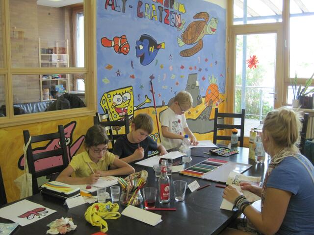 Zusammen mit dem Laatzener Künstler Michael Hoyer entstehen heute farbenfrohe Bilder von Pflanzen, netten Sitzecken und viel Sonne!