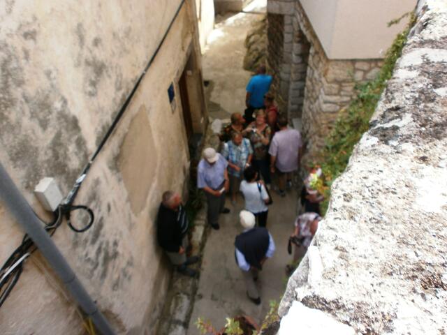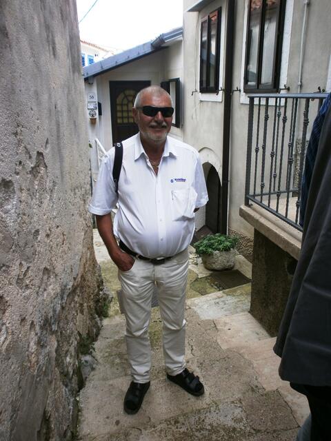Hinter der Kirche, auf dem ehemaligen Friedhof, genossen wir eine Wahnsinnsaussicht über die Kvarner Bucht. Meine Gäste fragten den Bürgermeister, woher er denn so gut deutsch sprechen kann. Ein geheimnisvolles Lächeln spielte um seinen Mund und die Erinnerung ließ seine Augen leuchten. „Jaaa“, sagte er, „das kam so: Unten in Draga Moscenice urlaubte ein deutsches Mädchen im Hotel - im Zimmer Nummer 111. Cornelia hieß sie und sie ist heute meine Frau. Dort lernte ich meine Cornelia kennen. Sie verließ für mich ihre Heimat, Arbeit, Eltern und kam mit mir in dieses kleine Dörfchen um eine Familie zu gründen“. Das war zu Titos Zeiten für eine Deutsche nicht einfach. Seine Eltern waren entsetzt, der Pfarrer war entsetzt, das ganze Dorf war entsetzt, aber es war so eine große Liebe mit seiner Cornelia, dass die Ehe alles aushielt und sie jetzt schon 35 Jahre die Frau des Bürgermeisters ist.