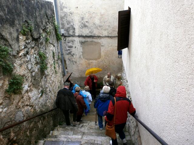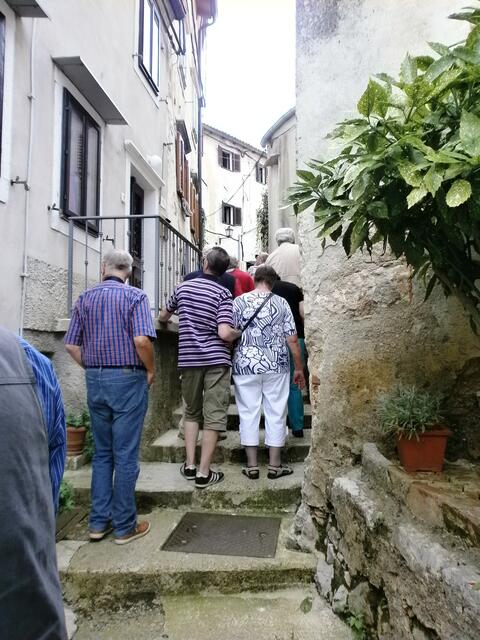 Wie soll man auch diesen Bürgermeister erklären. Ihn muss man erleben. Er ist einmalig. Lustig stellt er seine „Stadt“ vor. Hand in Hand mit dem Pfarrer vermarktet er den kleinen Ort. In den vorangegangen Jahrhunderten waren wir Piraten und kontrollierten von hier oben die Meerenge Vela Vrata. Mošćenice diente dem Schutz vor den Venezianern, erklärte er uns zu Anfang.