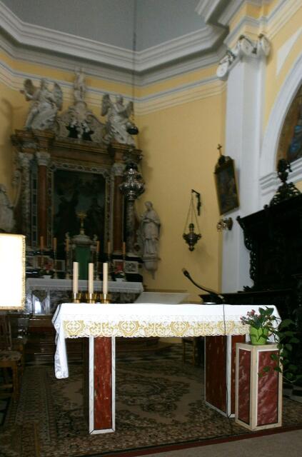 Anschließend gingen wir alle in die Kirche wo uns der Pfarrer empfing und die Geschichte seiner Kirche uns vorstellte, einschließlich der Postkarten und der kleinen Broschüre in verschiedenen Sprachen, die man käuflich erwerben konnte. Zum Abschluss sangen alle „Großer Gott wir loben Dich“ und weiter ging die Führung mit dem Bürgermeister „einmal rund um die Kirche“.
