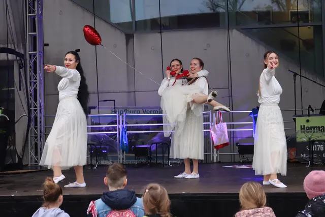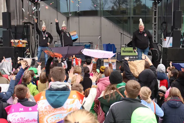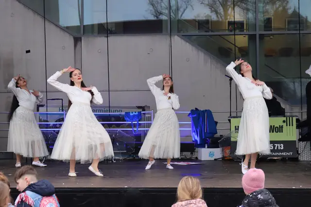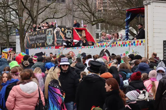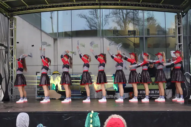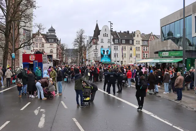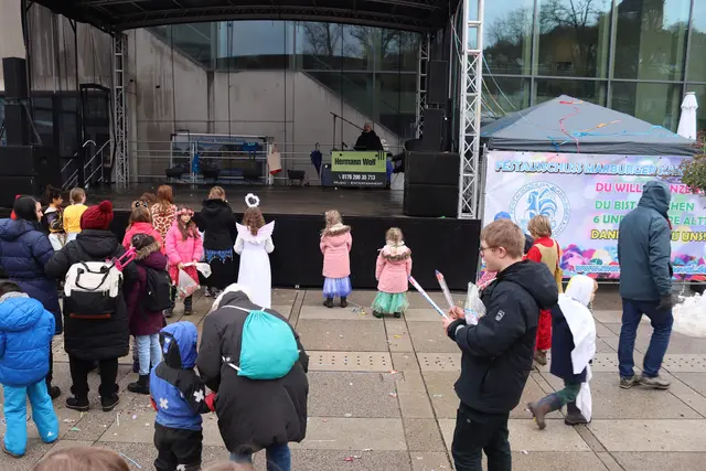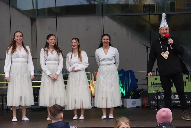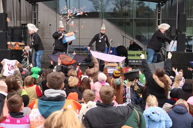 Auf der Bühne gab es zu bestimmten Zeiten besonderes Programm wie Tanzvorführungen. Dazwischen sorgte Hermann Wolf für ein buntes Musikprogramm. Zu bestimmten Zeiten wurden Kamelle-Würfe angekündigt. Das nutzten zahlreiche Kinder, um sich vor dem betreffenden Wagen beziehungsweise der Bühne aufzustellen. Neben Bonbons grab es auch größere Teile wie lange Riesen-Marshmellows. Nur die von der Bühne geworfenen Lutscher waren wohl nicht so gefragt, da zahlreiche am Boden blieben.