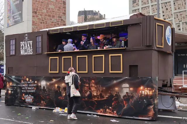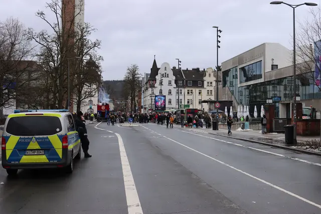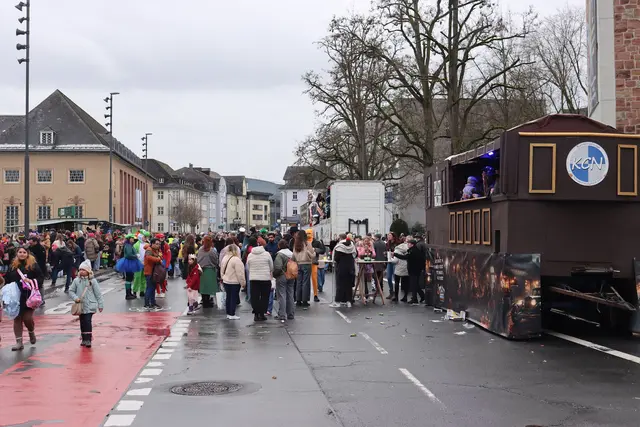 Vor einer Tanzvorführung gegen 16 Uhr wurden die letzten Kamellen geworfen. Danach leerte es sich deutlich, wobei noch einige Regentropfen fielen. Der Wagen aus Niederwalgern verließ das Gelände. Gegen 16:10 Uhr war es schon recht leer auf der Straße.