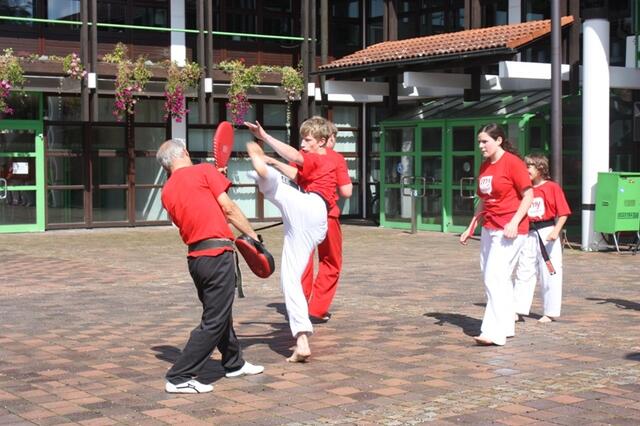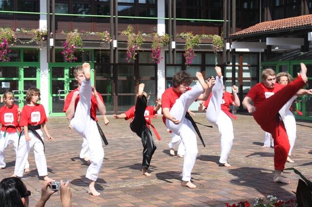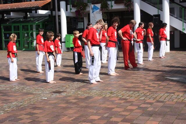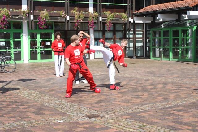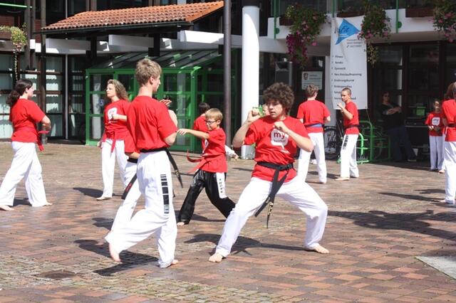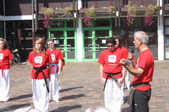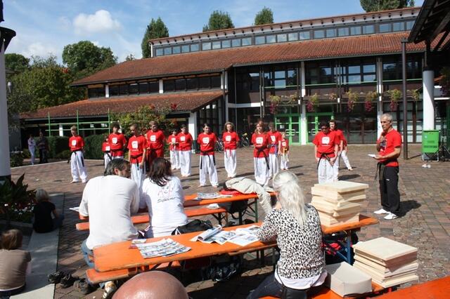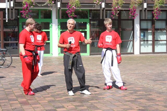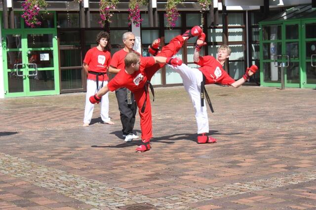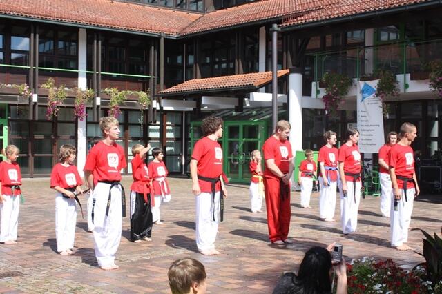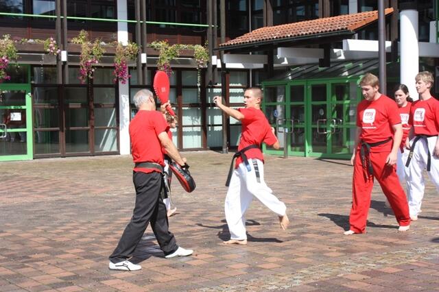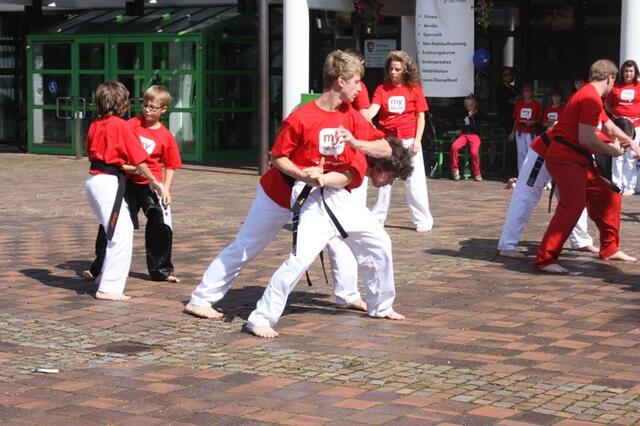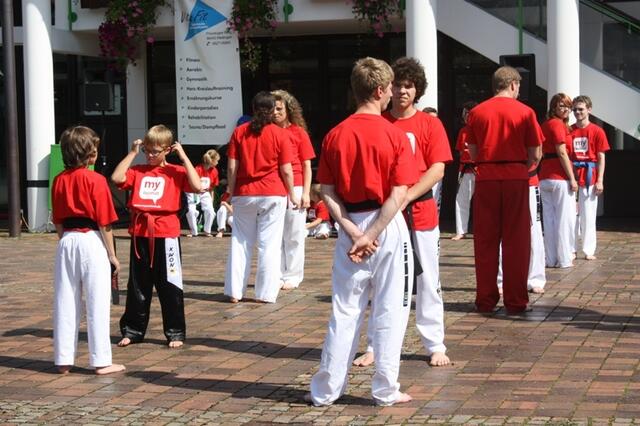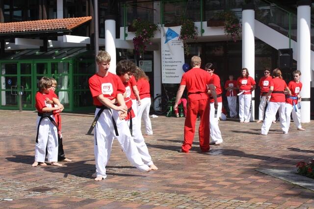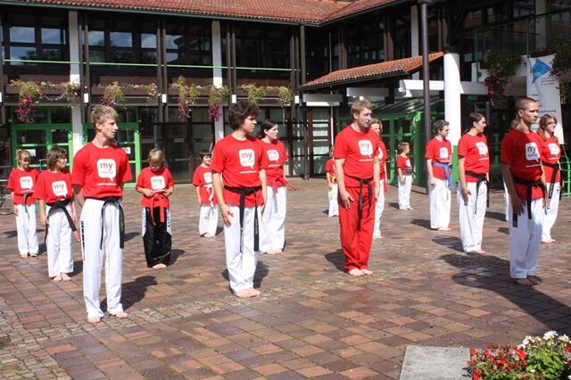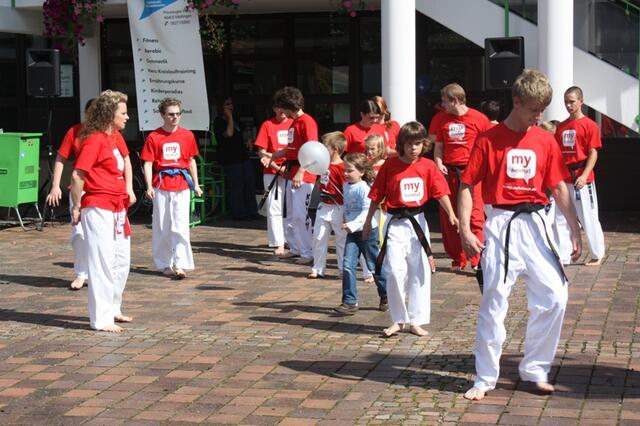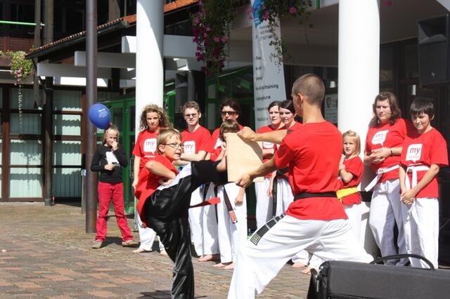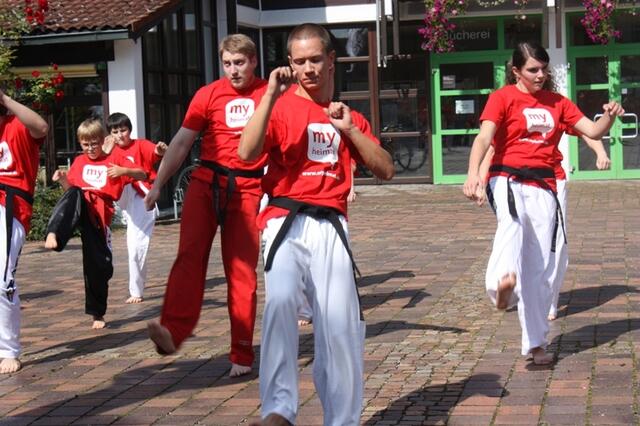 An beiden Messetagen auf der mega zeigten Ali Kocaman und seine jungen Kampfsportschüler auf dem Rathausplatz wieder ihr Können, und das - fast schon traditionell - am Samstag komplett in myheimat-T-Shirts gekleidet! Choreografien der ganz Kleinen oder der Jugend, zertrümmerte Holzbretter nach spektakulären Schlägen und Tritten und sogar ein zerbrochener Fluss-Stein versetzten die vielen Zuschauer ins Staunen.