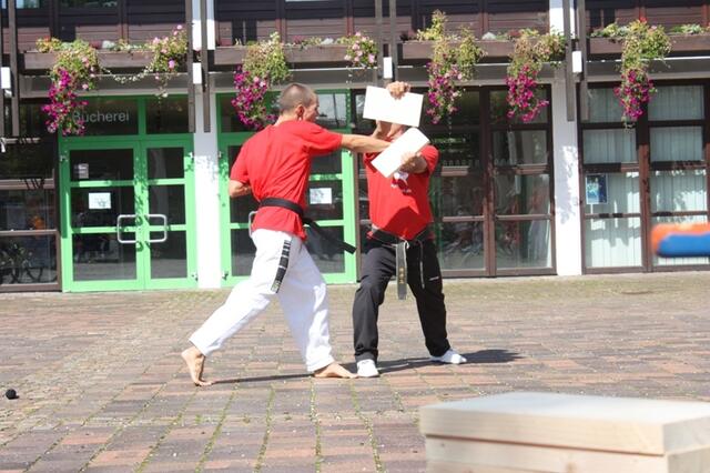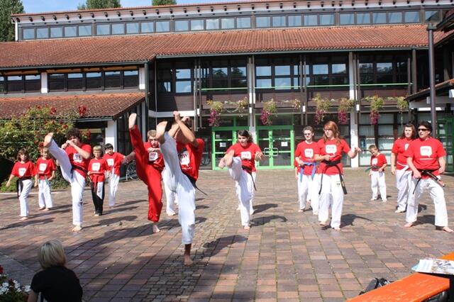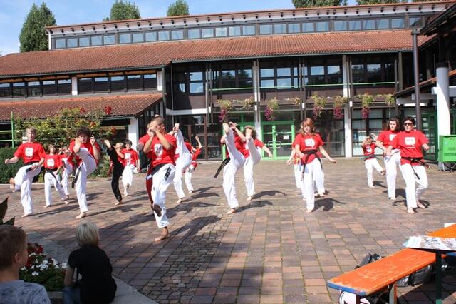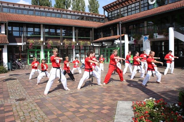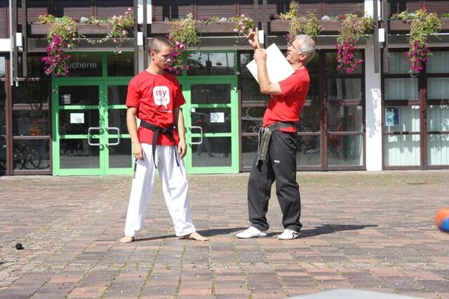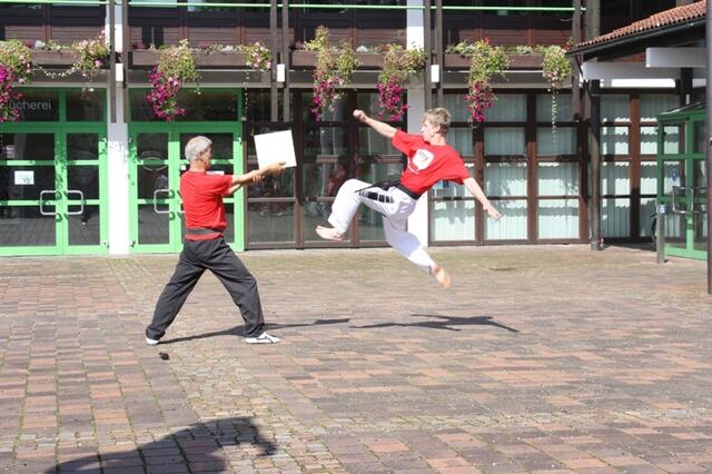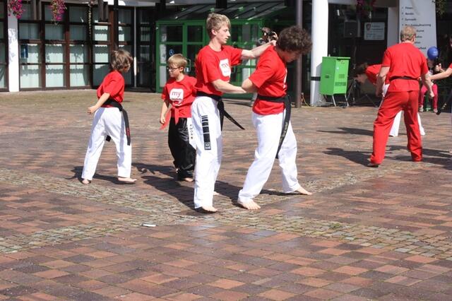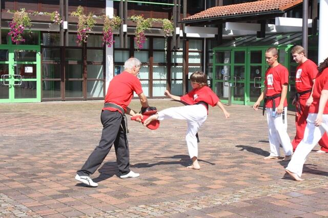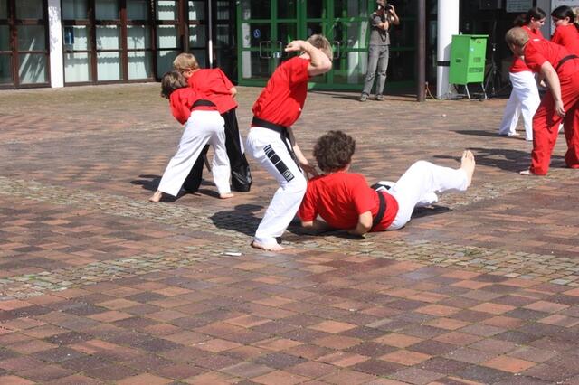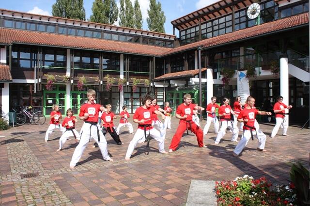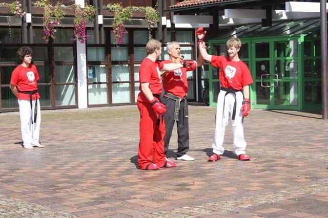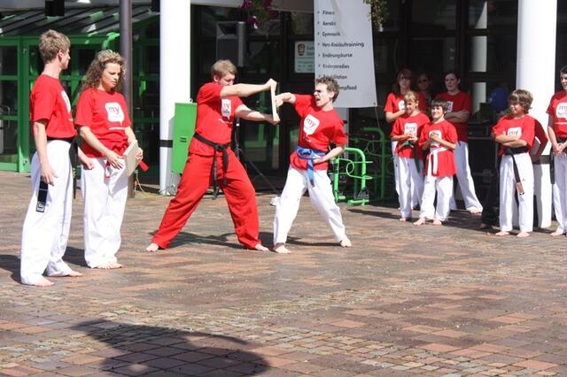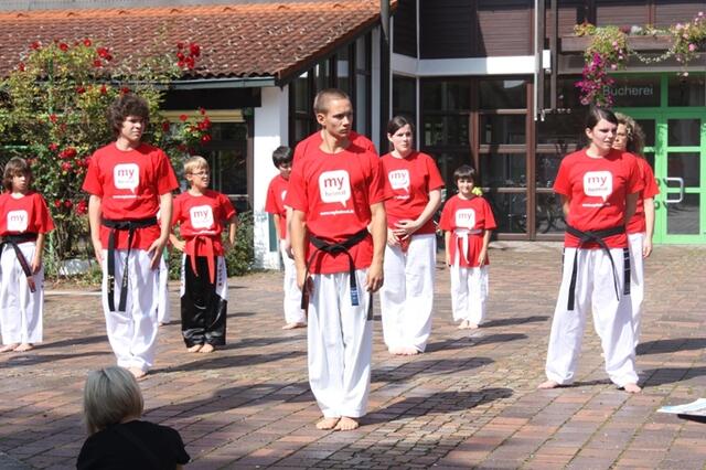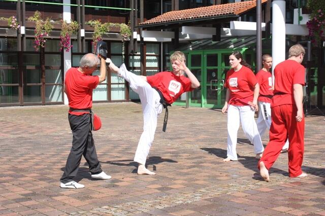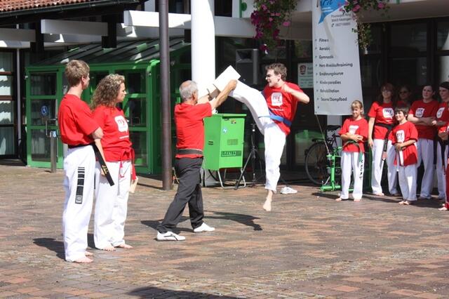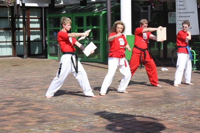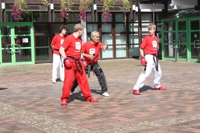 An beiden Messetagen auf der mega zeigten Ali Kocaman und seine jungen Kampfsportschüler auf dem Rathausplatz wieder ihr Können, und das - fast schon traditionell - am Samstag komplett in myheimat-T-Shirts gekleidet! Choreografien der ganz Kleinen oder der Jugend, zertrümmerte Holzbretter nach spektakulären Schlägen und Tritten und sogar ein zerbrochener Fluss-Stein versetzten die vielen Zuschauer ins Staunen.