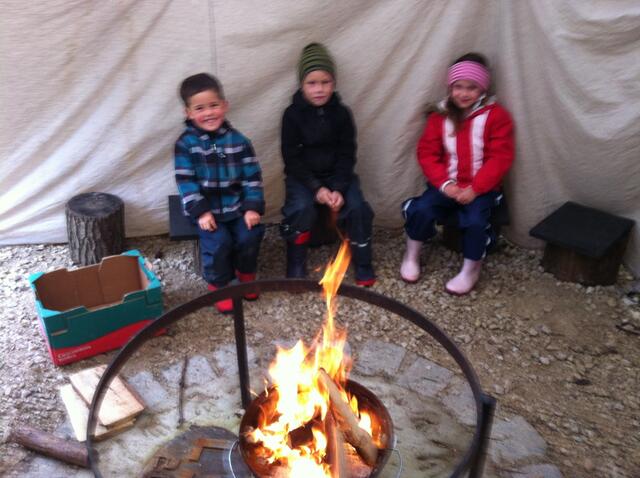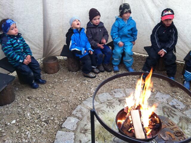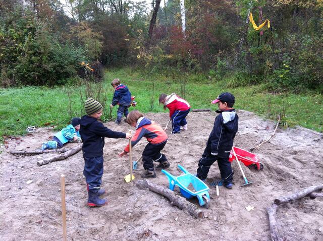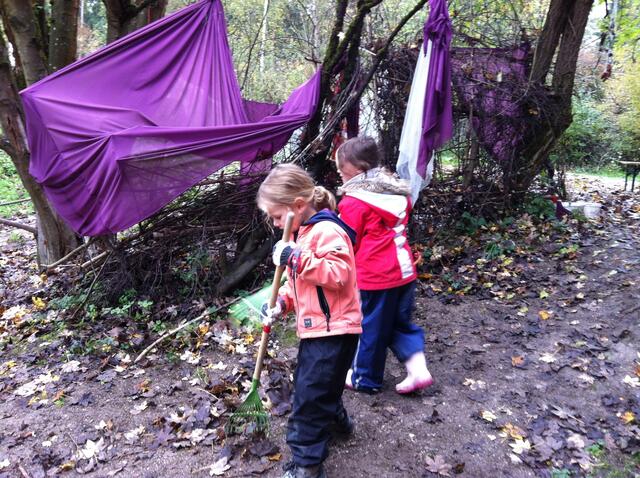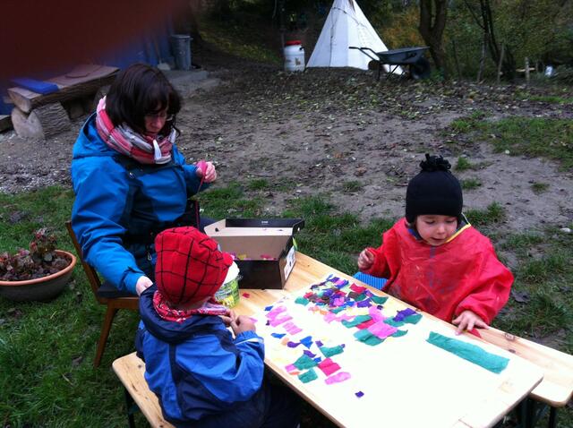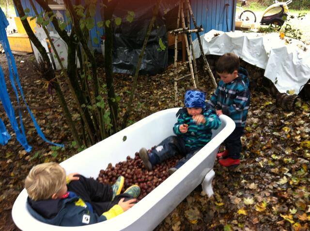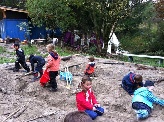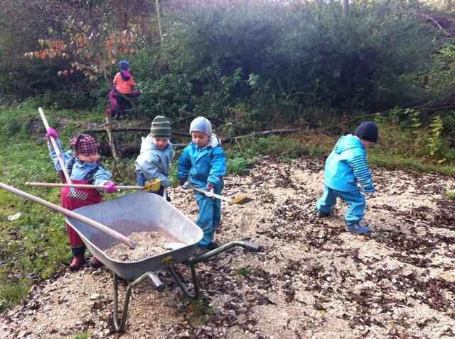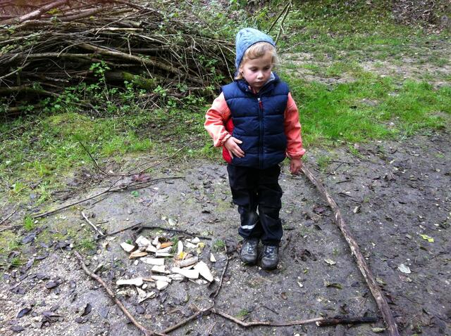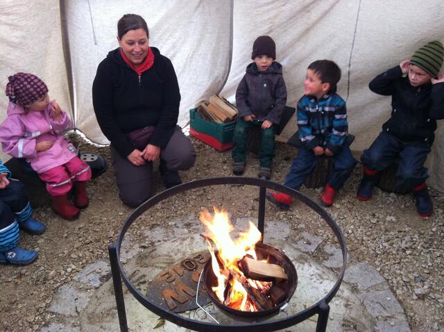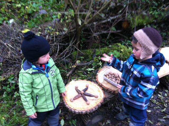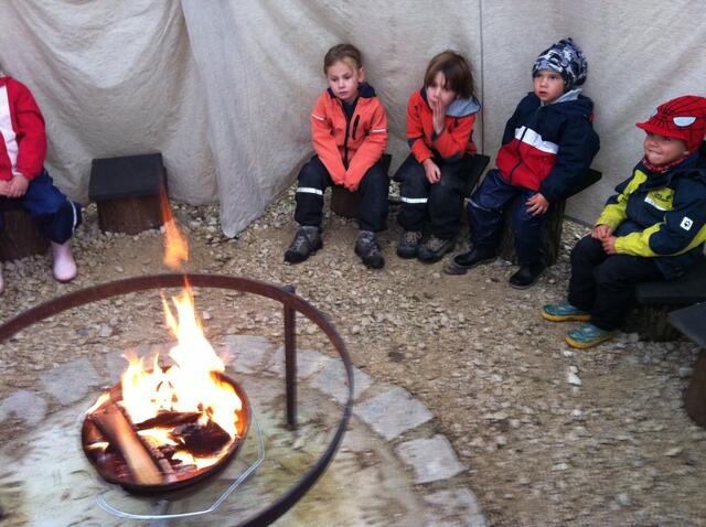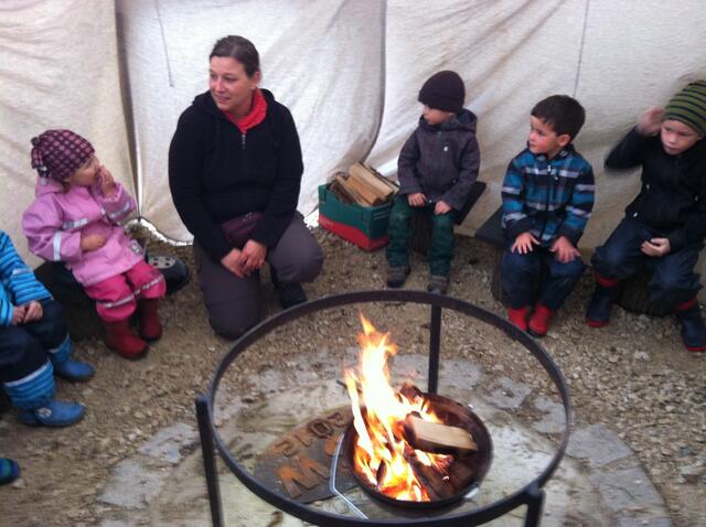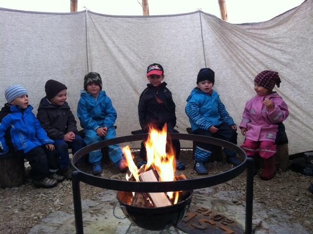 Nach der Morgenrunde geht´s hinaus in die Natur. Dort werden dicke Äste hin und her transportiert um etwas Neues daraus zu bauen, oder im „Lager“ gespielt. Einige Vorschulkinder versuchen sich daran den Kastanienbaum zu erklimmen, zwei jüngere Kinder vergnügen sich in der Kastanienbadewanne. In einem Bereich legen die Kinder große und kleine Mandalas aus Steinen, Kastanien, Zapfen und allem was man im Wald so finden kann. Vor dem Tipi ist durch den Regen eine große Pfütze entstanden, die muss mit Kies und Lehm wieder dicht gemacht werden. Mit Schubkarren und Schaufeln gehen die Kinder ans Werk. Da kommt man ganz schön ins Schwitzen, selbst wenn schon ein kühler Nebel über dem Waldkindergarten liegt. Um 9.30 Uhr ertönt die Waldflöte, das Zeichen für alle, sich oben am Platz einzufinden. Alle Kinder holen ihre Handtücher aus den Rücksäcken und stellen sich in einer Reihe auf. Mit Lavaerde waschen sie sich die Hände und dann geht es wieder ins kuschlig warme Tipi zum Brotzeitmachen. Mit roten Wangen sitzen die Mädchen und Buben am Lagerfeuer und lassen es sich schmecken. So gestärkt kann der zweite Teil des Tages beginnen. Die Kinder können sich wieder in ihr Spiel vertiefen. Außerdem gibt es für einzelne Kinder oder Kleingruppen von den Pädagoginnen verschiedene Angebote. Zur Zeit dreht sich dabei alles um den Herbst, die Natur und natürlich auch um die anstehenden Feste wie St. Martin, Nikolaus und Weihnachten. Die Kinder basteln Laternen, hören Geschichten oder singen zusammen. Mehrmals die Woche gibt es für die großen Kinder, die im September 2013 in die Schule kommen, zusätzliche Aktionen. Derzeit ist das das Würzburger Trainingsprogramm, das selbstverständlich auch im Waldkindergarten einen festen Platz hat. Immer wieder macht die ganze Gruppe auch einen gemeinsamen Streifzug durch die Lechauen. „Wie viel Wasser hat der Lech heute?“ oder „Wer findet den Weg zum Waldsofa?“ ist dabei gefragt. Um 12.00 Uhr ertönt erneut die Waldflöte und alle Kinder treffen sich im Tipi. Die Kinder lassen Tag revue passieren und singen und spielen noch einmal gemeinsam. Die ersten Kinder werden jetzt auch schon abgeholt. Bis 13.00 Uhr können die Waldkinder dann noch einmal Brotzeit machen oder spielen. Dann ist für alle ein erlebnisreicher Tag im Wald zu Ende, bis morgen wieder die nächsten Abendteuer beginnen.