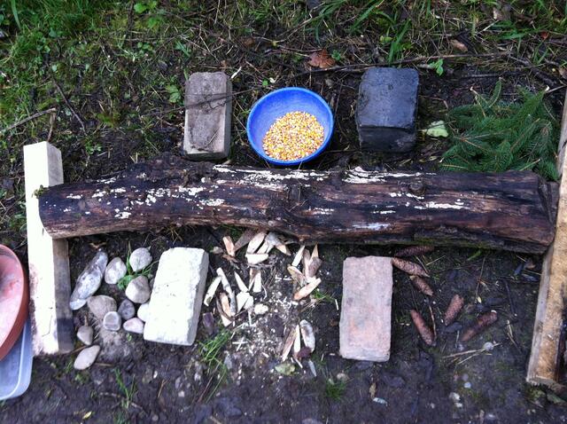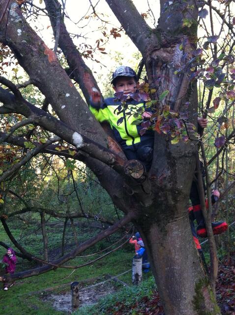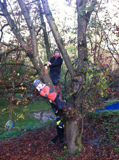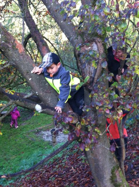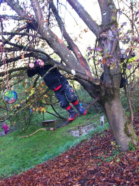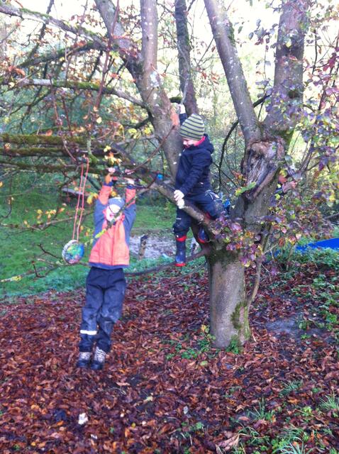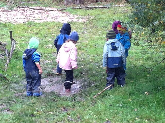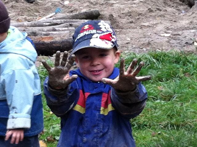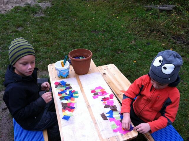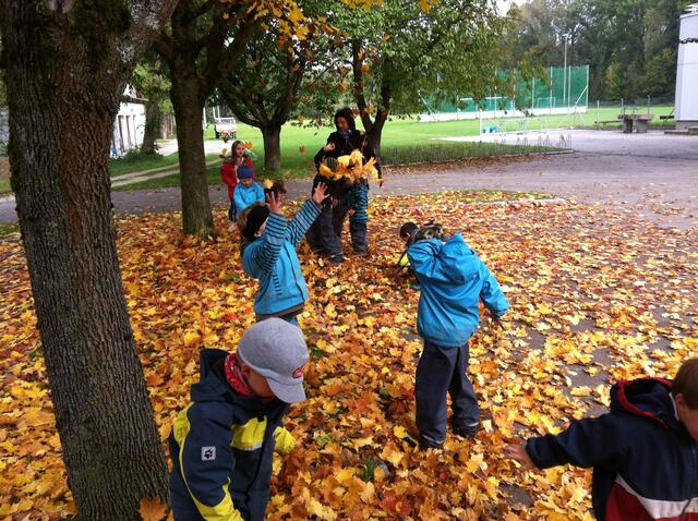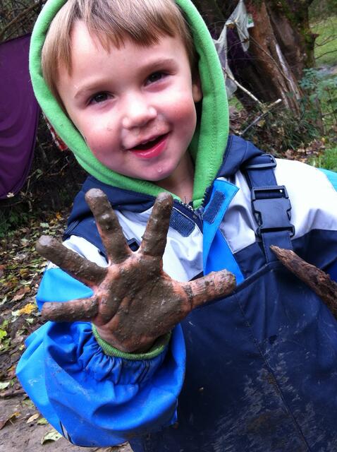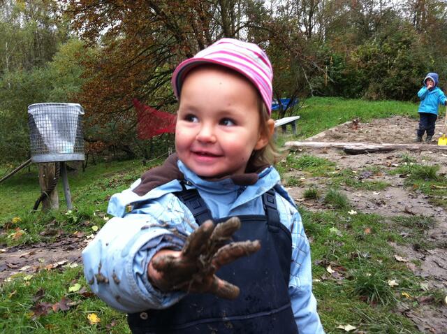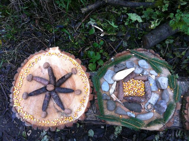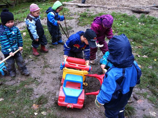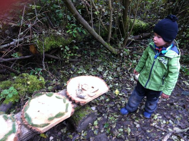 Nach der Morgenrunde geht´s hinaus in die Natur. Dort werden dicke Äste hin und her transportiert um etwas Neues daraus zu bauen, oder im „Lager“ gespielt. Einige Vorschulkinder versuchen sich daran den Kastanienbaum zu erklimmen, zwei jüngere Kinder vergnügen sich in der Kastanienbadewanne. In einem Bereich legen die Kinder große und kleine Mandalas aus Steinen, Kastanien, Zapfen und allem was man im Wald so finden kann. Vor dem Tipi ist durch den Regen eine große Pfütze entstanden, die muss mit Kies und Lehm wieder dicht gemacht werden. Mit Schubkarren und Schaufeln gehen die Kinder ans Werk. Da kommt man ganz schön ins Schwitzen, selbst wenn schon ein kühler Nebel über dem Waldkindergarten liegt. Um 9.30 Uhr ertönt die Waldflöte, das Zeichen für alle, sich oben am Platz einzufinden. Alle Kinder holen ihre Handtücher aus den Rücksäcken und stellen sich in einer Reihe auf. Mit Lavaerde waschen sie sich die Hände und dann geht es wieder ins kuschlig warme Tipi zum Brotzeitmachen. Mit roten Wangen sitzen die Mädchen und Buben am Lagerfeuer und lassen es sich schmecken. So gestärkt kann der zweite Teil des Tages beginnen. Die Kinder können sich wieder in ihr Spiel vertiefen. Außerdem gibt es für einzelne Kinder oder Kleingruppen von den Pädagoginnen verschiedene Angebote. Zur Zeit dreht sich dabei alles um den Herbst, die Natur und natürlich auch um die anstehenden Feste wie St. Martin, Nikolaus und Weihnachten. Die Kinder basteln Laternen, hören Geschichten oder singen zusammen. Mehrmals die Woche gibt es für die großen Kinder, die im September 2013 in die Schule kommen, zusätzliche Aktionen. Derzeit ist das das Würzburger Trainingsprogramm, das selbstverständlich auch im Waldkindergarten einen festen Platz hat. Immer wieder macht die ganze Gruppe auch einen gemeinsamen Streifzug durch die Lechauen. „Wie viel Wasser hat der Lech heute?“ oder „Wer findet den Weg zum Waldsofa?“ ist dabei gefragt. Um 12.00 Uhr ertönt erneut die Waldflöte und alle Kinder treffen sich im Tipi. Die Kinder lassen Tag revue passieren und singen und spielen noch einmal gemeinsam. Die ersten Kinder werden jetzt auch schon abgeholt. Bis 13.00 Uhr können die Waldkinder dann noch einmal Brotzeit machen oder spielen. Dann ist für alle ein erlebnisreicher Tag im Wald zu Ende, bis morgen wieder die nächsten Abendteuer beginnen.