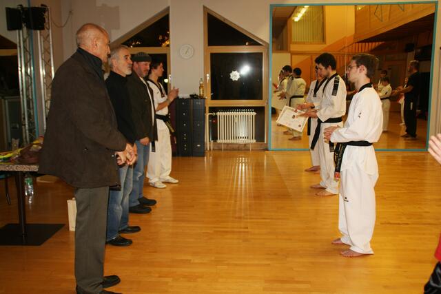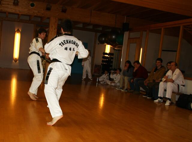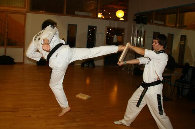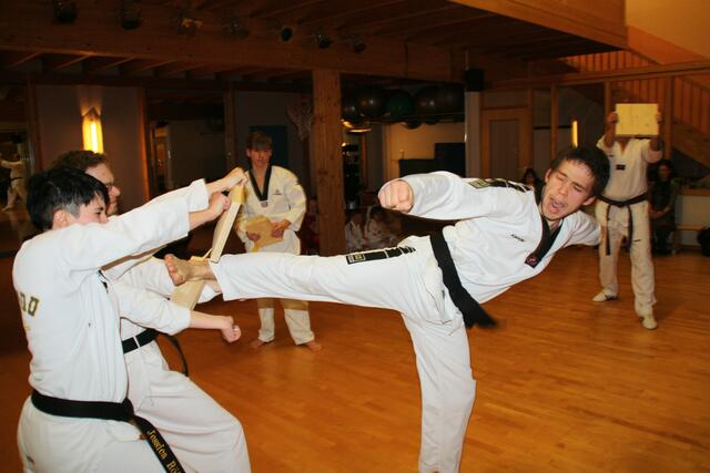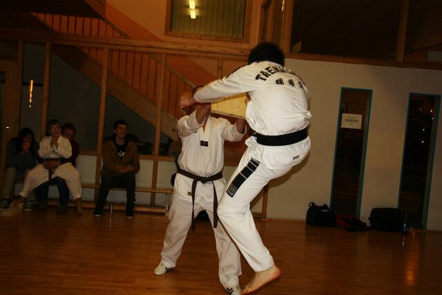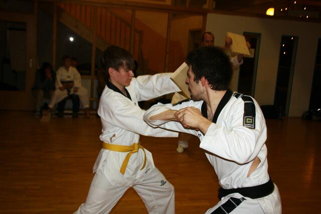 Ebenso gefordert war das Können in Einsteppsparing, Selbstverteidigung (Hosinsul) und Freiangriff. Auch theoretisches Fachwissen wurde abgefragt. Mit den Bruchtests, bei denen man zum 1. Dan drei und zum 3. Dan fünf Bretter mit verschiedenen Techniken zerstören muß, schloß man die Prüfung ab. Nachdem die Prüfer (Hauptprüfer Kocaman Ali 7. Dan mit dem Nebenprüfer Alkan Resul 5. Dan, Bastian Weber 3. Dan Taekwondo und Recep Mumcu 3. Dan) mit den gezeigten Leistungen zufrieden waren, konnte sich jeder Prüfling über den erreichten Dan freuen.