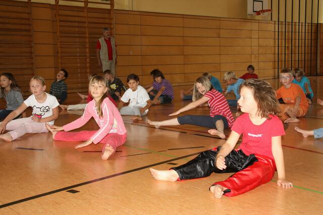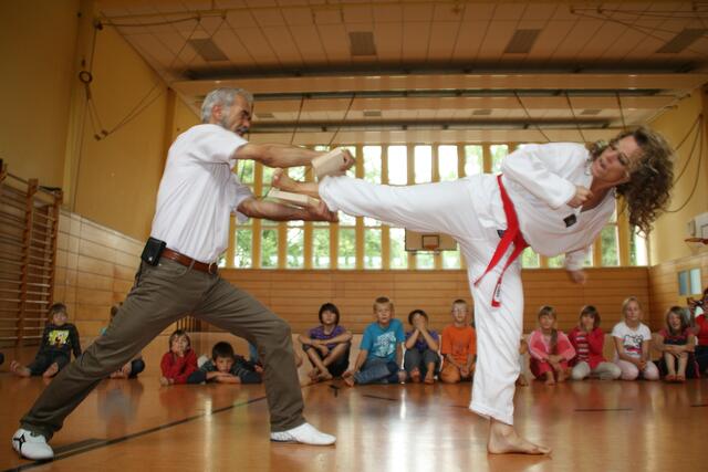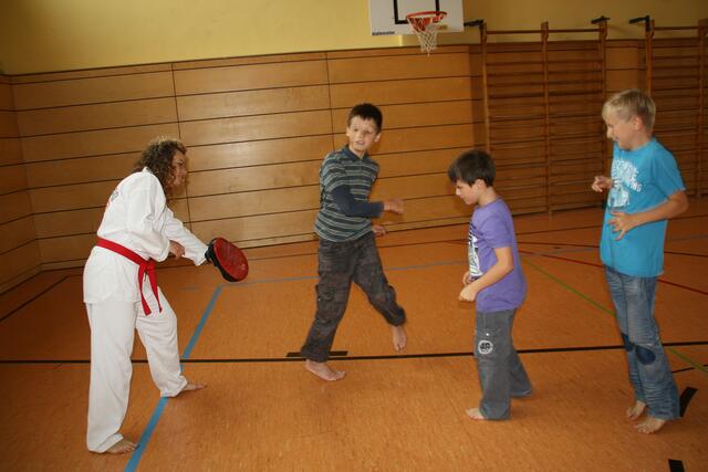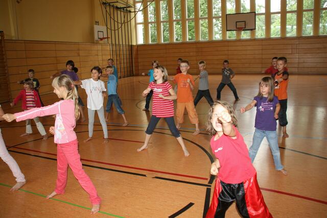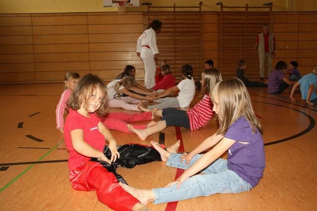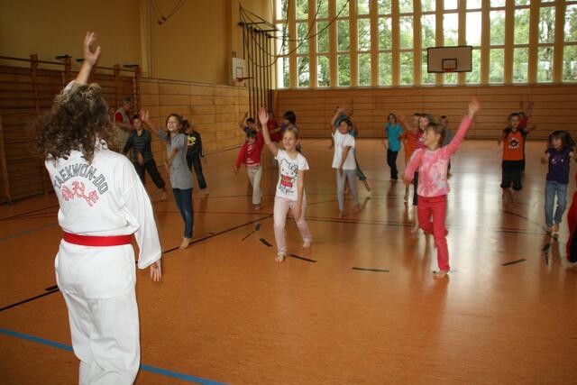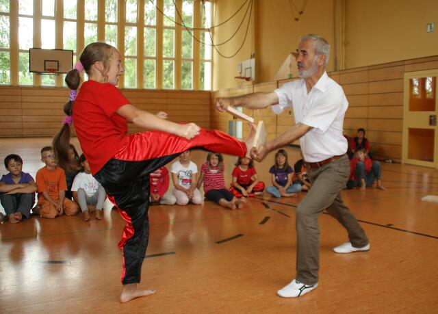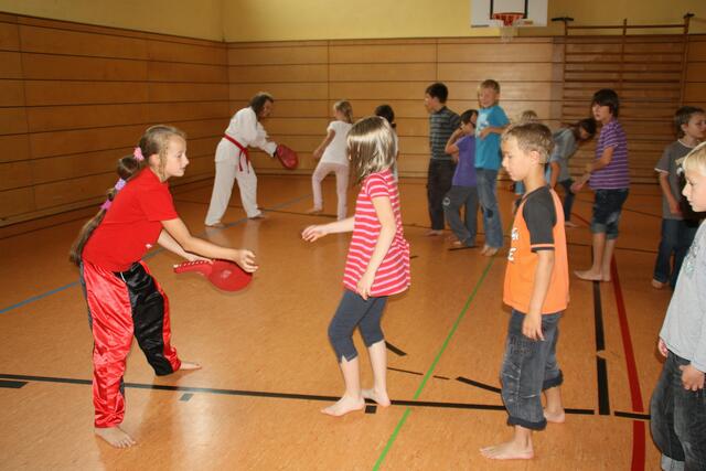 Im Rahmen des Ferienprogramms vom Frauenbund Meitingen in der Grundschule führte dort am Montag den 01. August die Kampfsportschule Kocaman eine Trainingseinheit durch. 22 Schüler nahmen an dieser sportlichen Aktion mit Begeisterung teil. Um 10 Uhr begannen wir wie bei jedem Training mit Gymnastik, Aufwärm- und Dehnungsübungen, um Verletzungen zu vermeiden. Danach zeigten wir Selbstverteidigungstechniken aus dem Allkampf Jitsu, welche die Kinder ganz gut umsetzen konnten. Das Pratzentraining, welches Elemente aus dem Kickboxen beinhaltet, brachte die Schüler wieder ein wenig zum Schwitzen. Um den Kindern einen kleinen Einblick in unser Training zu zeigen, führten wir zum Schluß noch einige Hyongs aus dem Taekwon-Do vor und demonstrierten Bruchtests, welche an den einzelnen Prüfungen erforderlich sind.