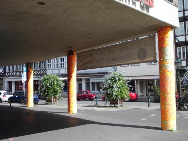 Auf unserem weiteren Weg fiel uns dann auf, dass auch Mülleimer, Pfähle und teilweise Schaufenster in der Knochenhauerstraße damit geschmückt sind. Nirgends fanden wir eine Erklärung dafür, aber wofür gibt es denn „Google“.