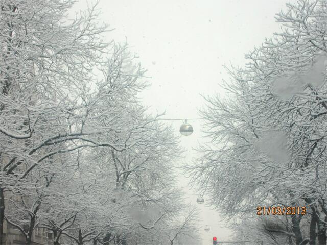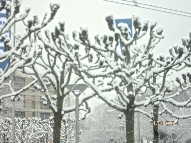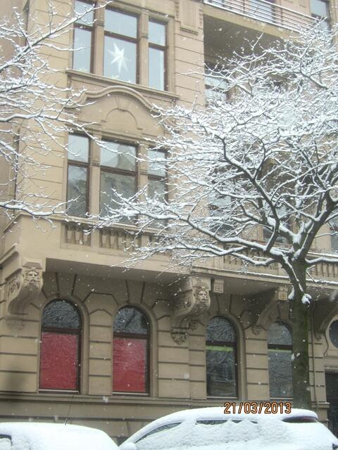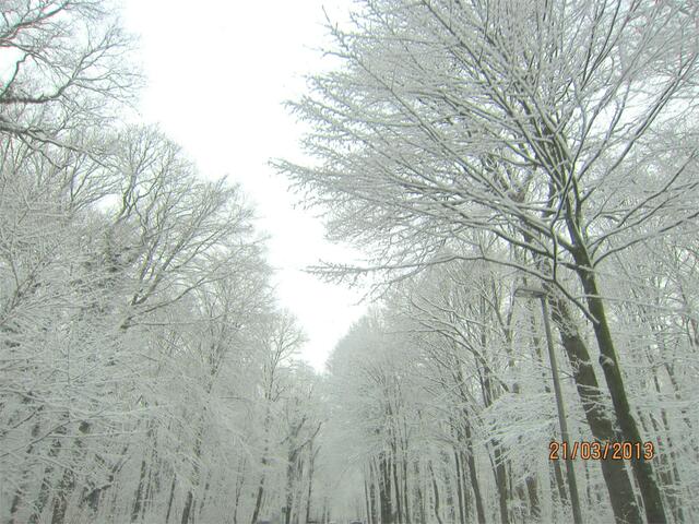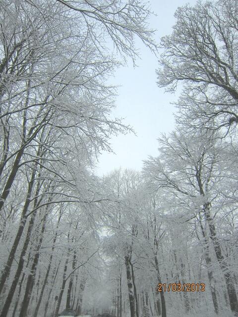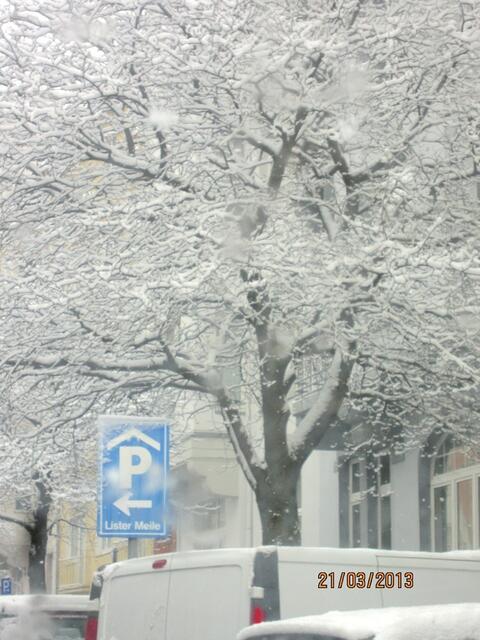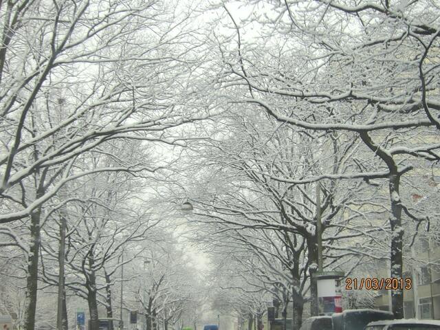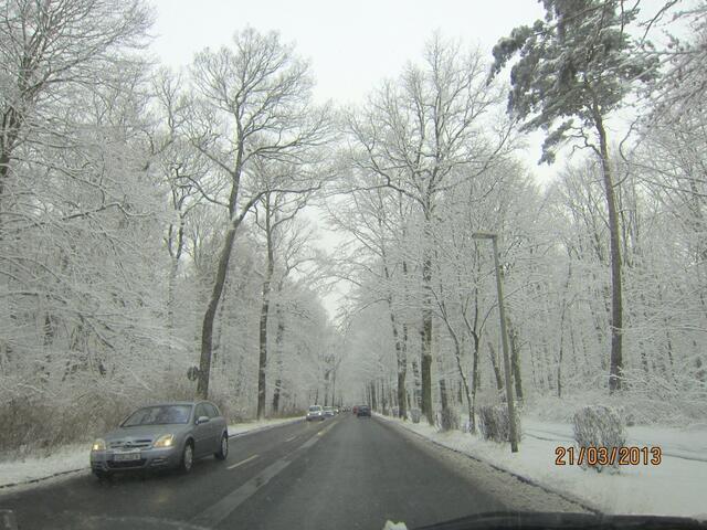 Auf der Bernadotteallee sah ich links und rechts die verschneiten Bäume aus dem Traum, aber ich konnte sie nicht genießen, denn hinter mir wurde gedrängelt. Es ging sehr langsam voran, da vor und nach dem Zebrastreifen eine Tempo-30-Zone eingerichtet wurde. Links uns rechts der Straße liefen Jogger und gingen Nordic Walker umher.