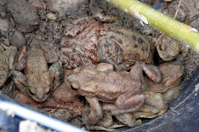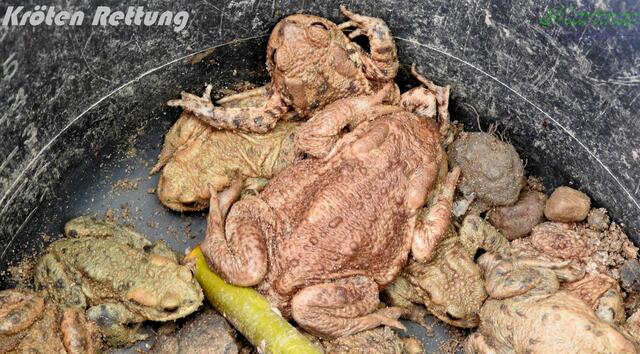 Wir waren so gegen 18 Uhr am See und waren erschrocken das so viele Kröten in den Eimern waren. Und leider schon viele Kröten tot rumlagen. Das Ufer der Kiesgrube ist so steil das die Kröten es sehr schwer haben dort hoch zu kommen. Noch viel schlimmer ist es aber das die Eimer nicht geleert wurden von den Menschen die den Auftrag hatten.