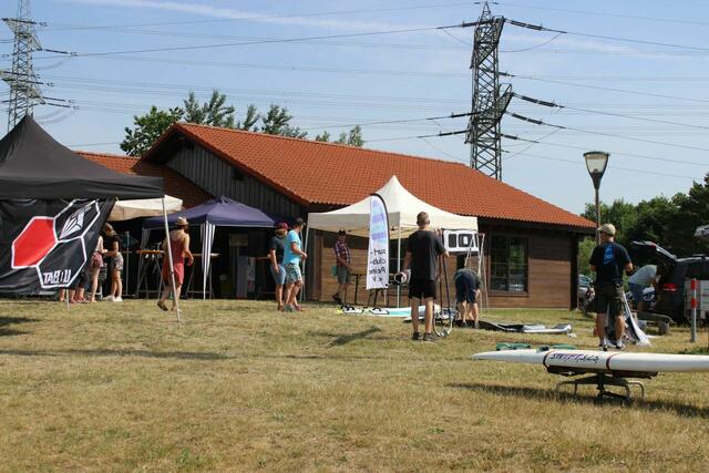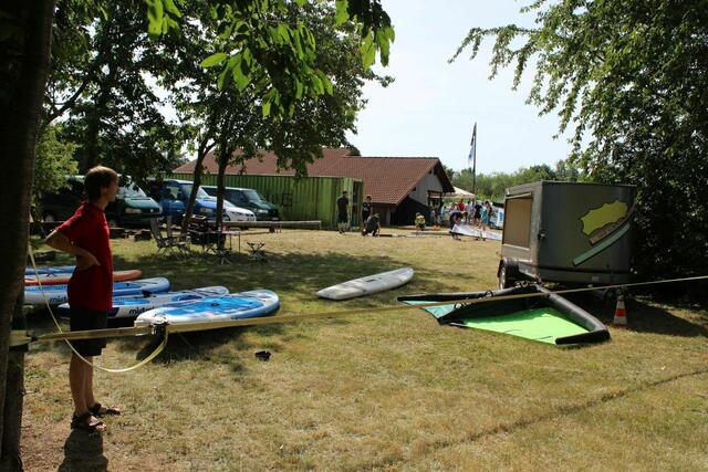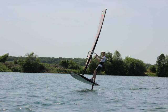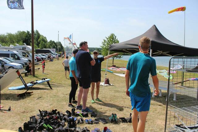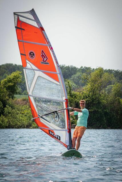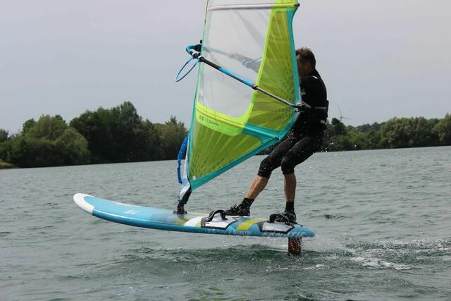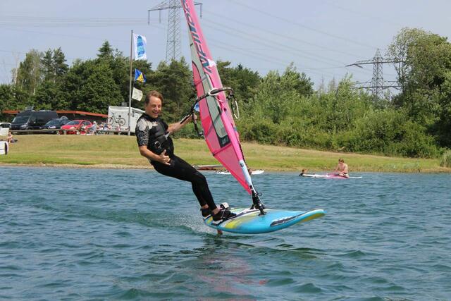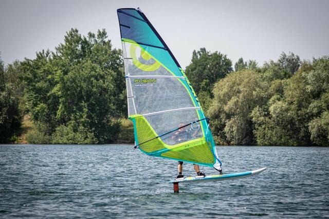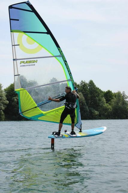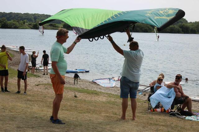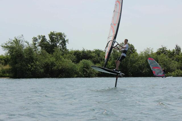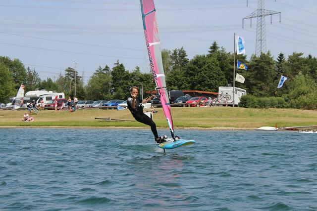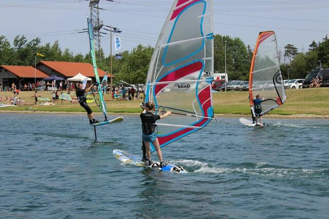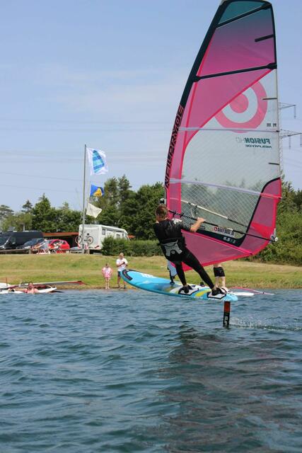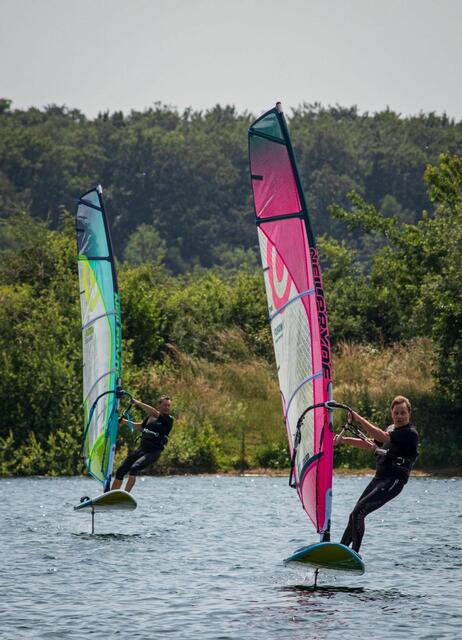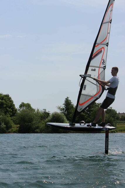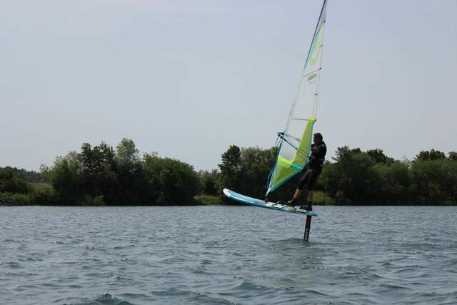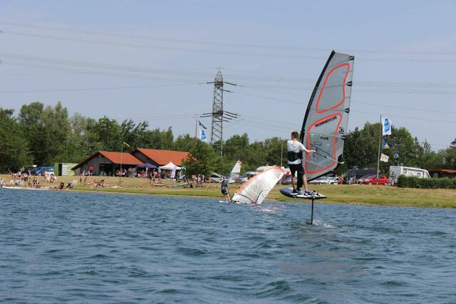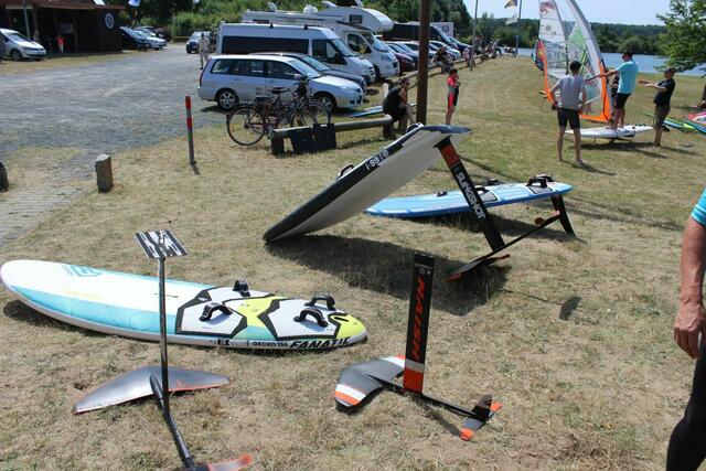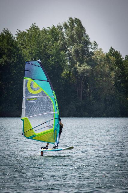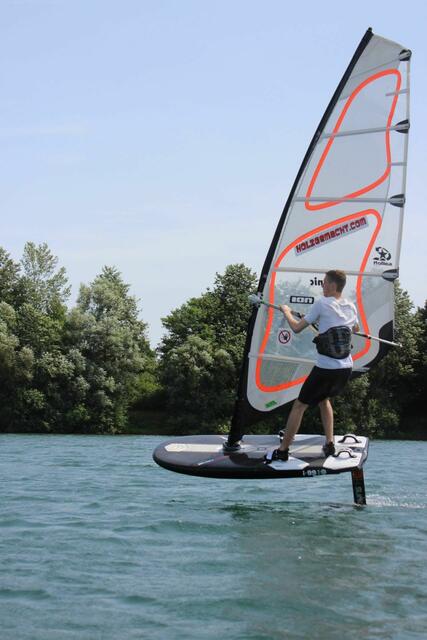 Sollte der Wind nicht nur säuseln, sondern zumindest phasenweise mit 3-4Bft. stark genug sein, werden auch die neusten Trends, das Windfoilen und das Wingfoilen von erfahrenen Surfern demonstriert. Das Surfbrett schwebt hier, getragen von einem „Unterwasserflügel“ = Hydrofoil komplett in der Luft über das Wasser, wie man es bei Tragflügelschnellbooten kennt. Beim Windfoilen benutzt man ein Segel, beim Wingfoilen einen Wing = Schirm als Antrieb. Selbst für semiprofessionelle Windsurfer zu Beginn eine ganz neue Dimension des „Schwachwindsurfens“ und eine neue Herausforderung.