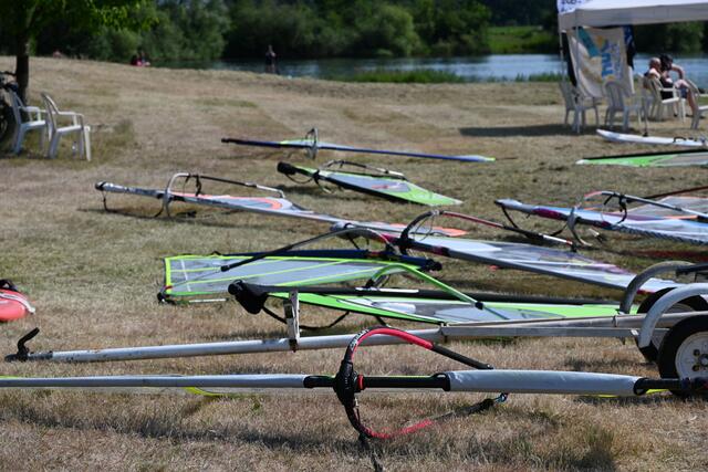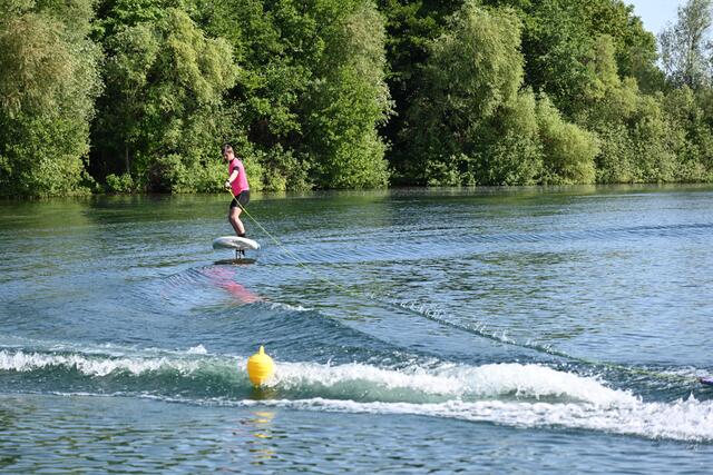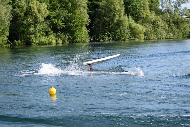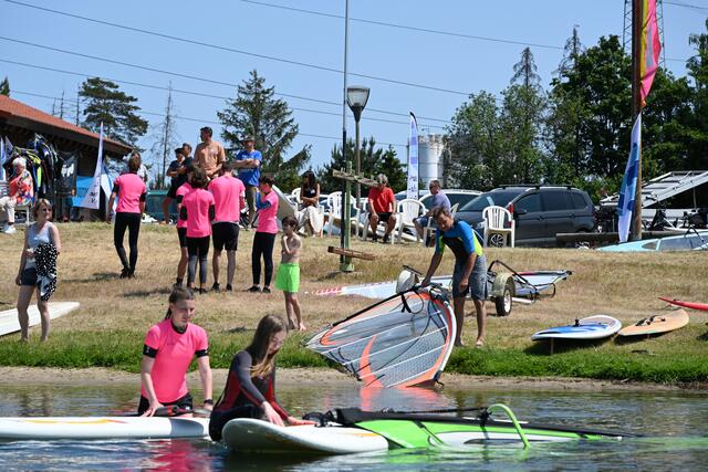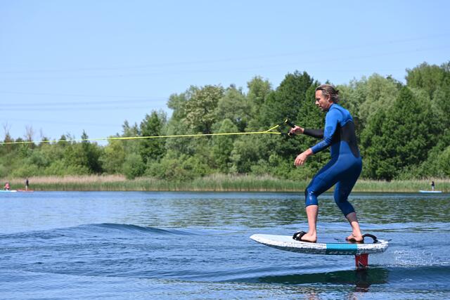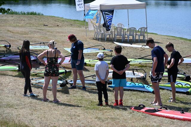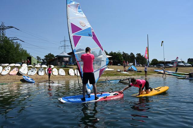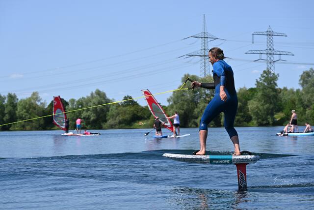 Sollte der Wind nicht nur säuseln, sondern zumindest phasenweise mit 3-4Bft. stark genug sein, werden auch die neusten Trends, das Windfoilen und das Wingfoilen von erfahrenen Surfern demonstriert. Das Surfbrett schwebt hier, getragen von einem „Unterwasserflügel“ = Hydrofoil komplett in der Luft über das Wasser, wie man es bei Tragflügelschnellbooten kennt. Beim Windfoilen benutzt man ein Segel, beim Wingfoilen einen Wing = Schirm als Antrieb. Selbst für semiprofessionelle Windsurfer zu Beginn eine ganz neue Dimension des „Schwachwindsurfens“ und eine neue Herausforderung.
