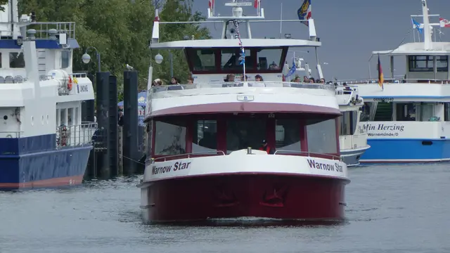 Das FGS Warnow Star beim Aufdrehen im Alten Strom von Warnemünde. Schiffsdaten: Name: WARNOWSTAR gemeldet in: Warnemünde Warnow-Personenschifffahrt,Warnemünde Nationalität: Deutschland MMSI-Nr.: 211549170 Rufzeichen: DG 4994 Länge: 24,50 m Breite: 7,22 m Tiefgang: 1,10 m Fahrg.: 180 Pers. Maschinenleistung: 230 PS Maschine: IVECO/FPT Marine-Diesel N 67-280 Baujahr: 2008 erbaut in: Niederlanden Bauwerft: Scheepsrepa