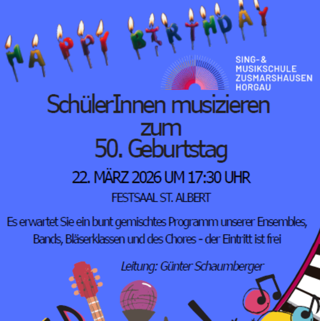 Die Sing- und Musikschule Zusmarshausen-Horgau wird dieses Jahr 50 Jahre alt! Aus diesem Anlass finden verschiedene Festveranstaltungen statt. Die erste dieser Veranstaltungen ist das Jubiläumskonzert einiger unserer Schülerinnen und Schüler. Hierzu laden wir Sie herzlich am Sonntag, 22. März 2026, um 17:30 Uhr in den Festsaal „St. Albert“ Zusmarshausen, Hochstiftstr. 6, ein! Es erwartet Sie ein bunt gemischtes Programm, gestaltet von unseren Bläserklassen, Bands, Ensembles und dem Chor....