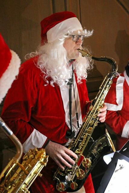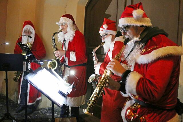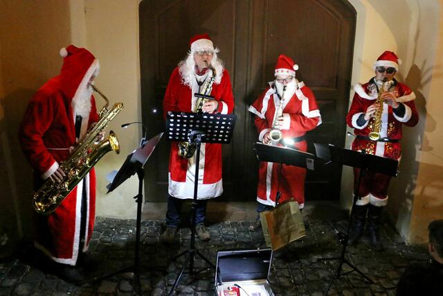 Einen Tag später waren die Saxophonbesitzer auf dem Weihnachtsmarkt von Bad Homburg, wo sie im Durchgang zum Schlosshof standen. Dort waren sie vor den Regentropfen geschützt, die immer mal fielen. Auf dem Weihnachtsmarkt hatten die Saxophonbesitzer aber nicht ihre ganze Kollektion an Saxophonen dabei.