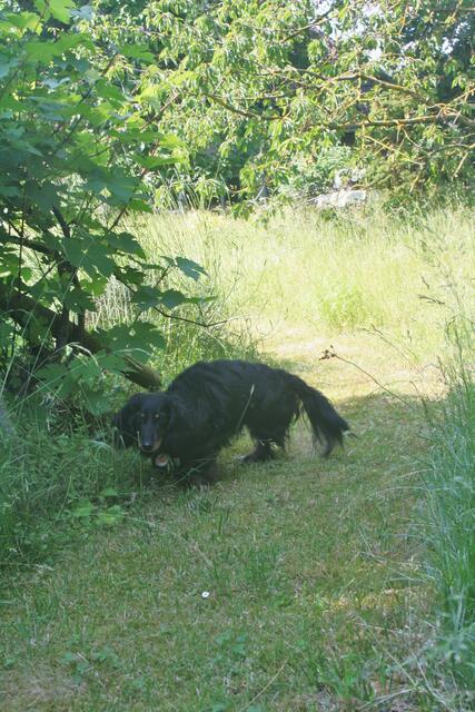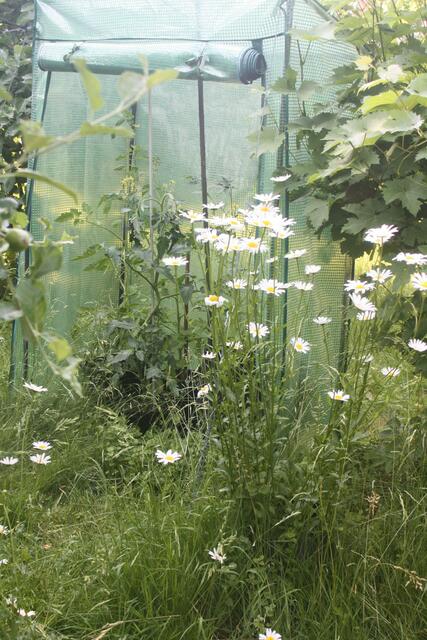 Ich bin mit Rudi in die Tiefen des Gartens eingedrungen, auf Wegen vom Rasenmäher geformt. Wir haben den Tomaten in ihrem Unterstand beim Wachsen zugesehen. Rudi hat den Weinstock gedüngt.