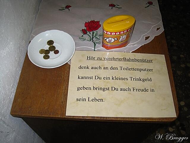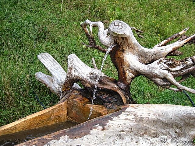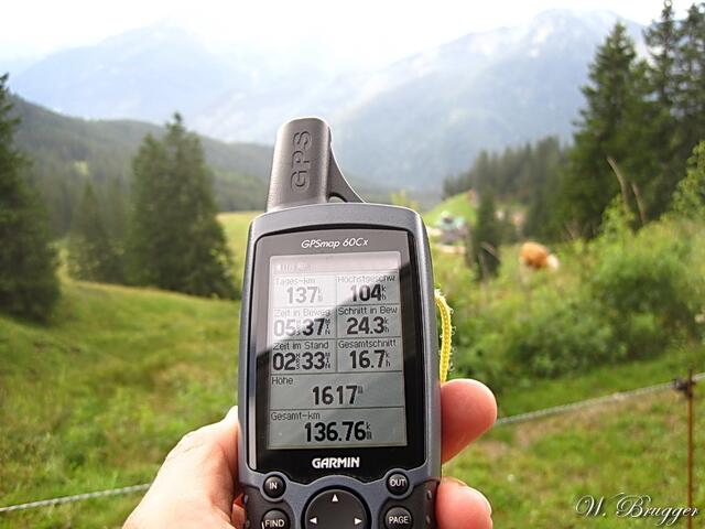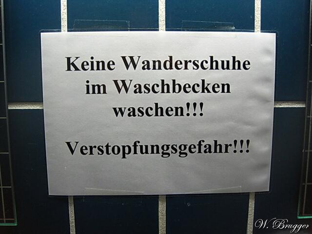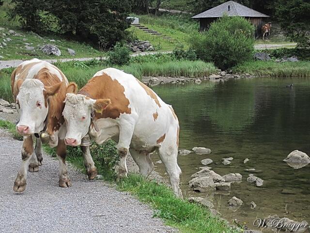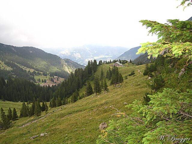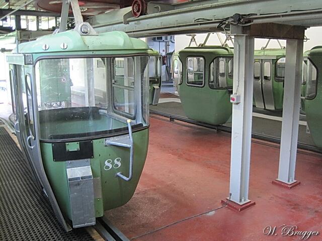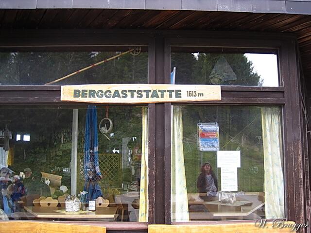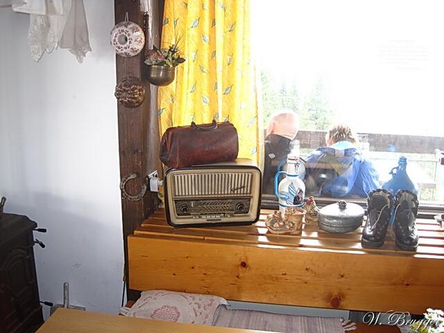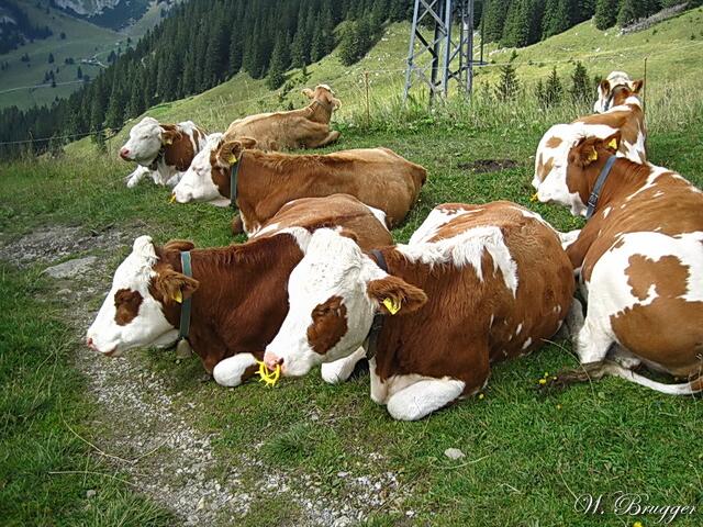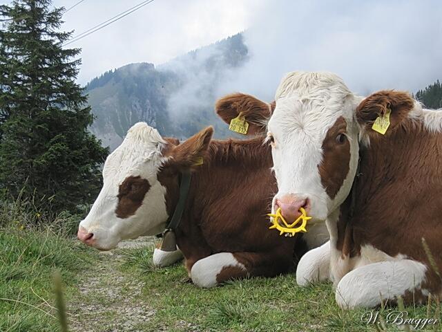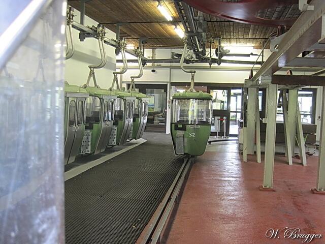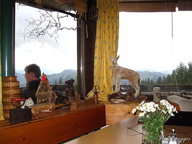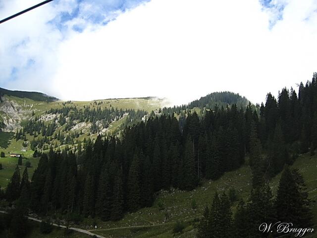 Oben dann angekommen, treffen wir auf Wanderer, die von noch weiter oben kommen, mit Schlamm bedeckten Hosenbeinen und manchmal einem Hosenboden, der ähnlich verschmutzt ist. Sie kommen vom Gipfelkreuz, wo sich wohl Wasser mit Erde vermengt hat. Für den Gehbehinderten in mir ist leider mit dem kleinen Plateau rund um die Bergstation Ende der berühmten Fahnenstange, da die Weg alle zu steil sind, um trotz Gehstöcken sicher zu gehen. Was bleibt, sind die Kühe, die Berge und die an- und abfahrenden Gondeln zu betrachten und das sehenswerte Innere der Bergstation: Die Gaststätte, zu entdecken und den üblichen Capuccino zu schlürfen.