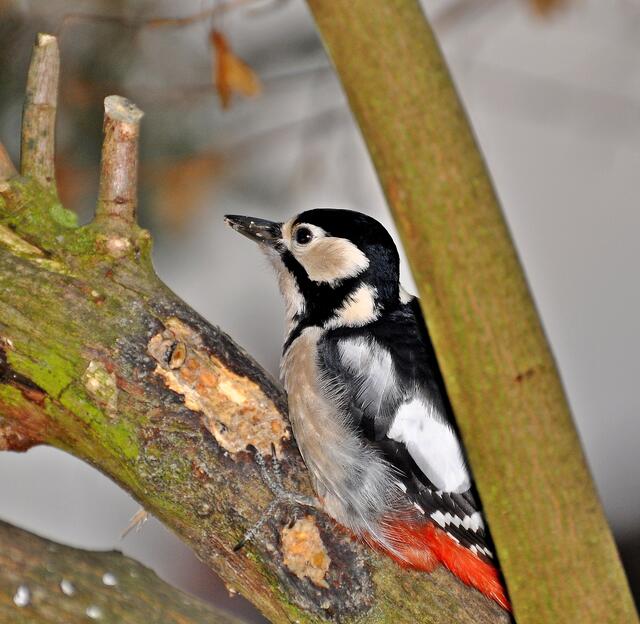 Dabei hatte ich erwähnt, dass auch eine Buntspechtdame Interesse an diesem Plätzchen signalisiert hatte. Aber über ein interessiertes Beobachten gingen die Aktivitäten der Spechtdame bisher nicht hinaus.