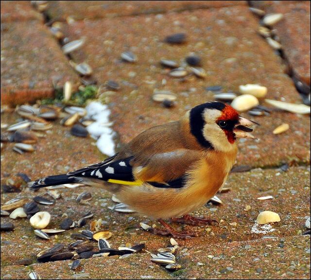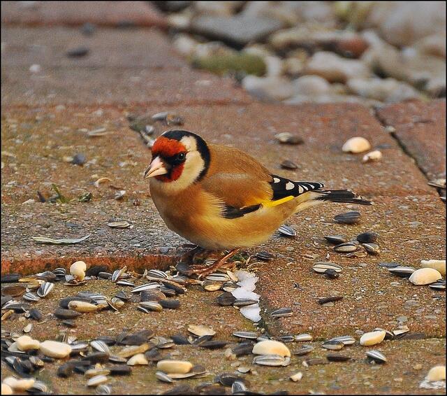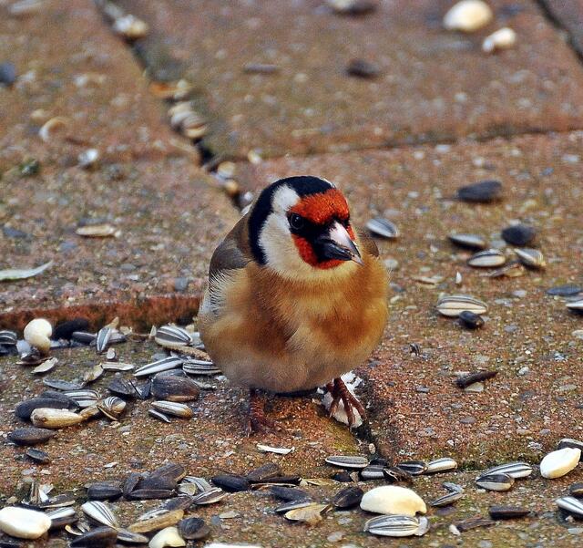 Da die Stieglitze im Gegensatz zu den Grünfinken ihr Futter besonders gern am Boden aufnehmen, habe ich heute morgen ein paar Sonnenblumenkerne und Erdnüsse ausgestreut. Kaum getan, fand sich denn auch gleich ein Stieglitz ein.