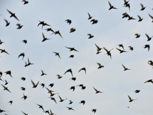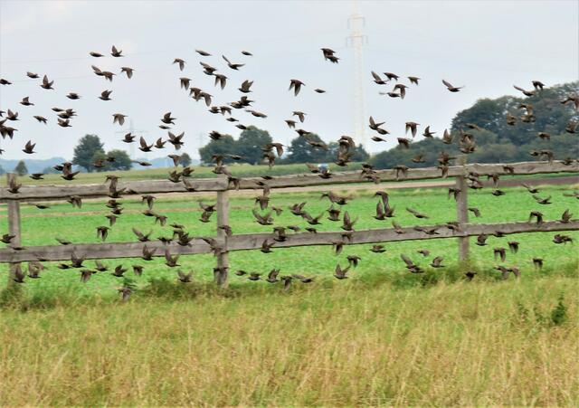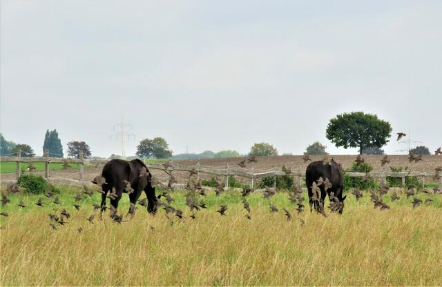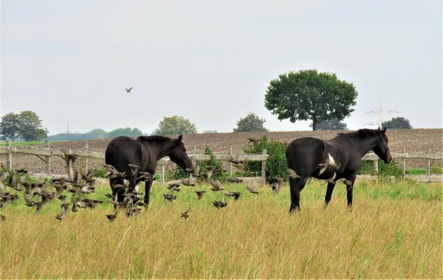 Die beiden Pferde auf der Weide wurden umschwärmt von den Vögeln,
