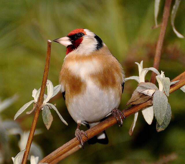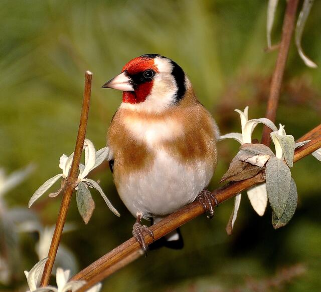 Und dann geschah es: Der Distelfink hatte sich erbarmt und erlöste mich von allen Qualen. Mit elegantem Schwung setzte er sich in etwa 4 m Entfernung auf einen Zweig des Sommerflieders perfekt in Positur und ließ sich weiter nicht stören. Auch meine Blitzserie tangierte ihn nicht. So hatte ich Gelegenheit etwa ein Dutzend Aufnahmen zu schießen und meine Fotografenseele hatte endlich ihre Ruhe.
