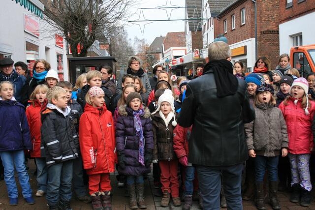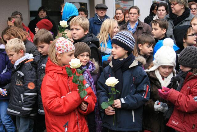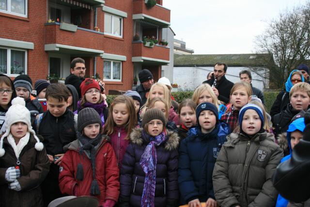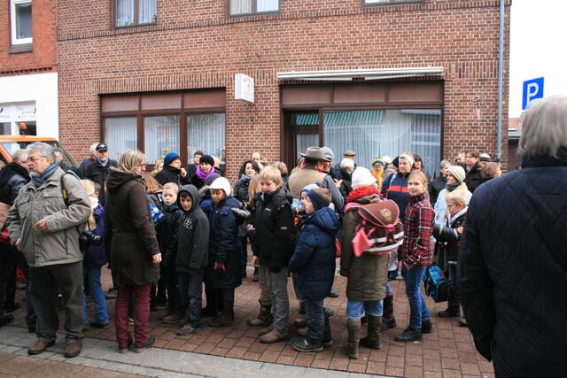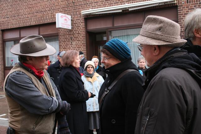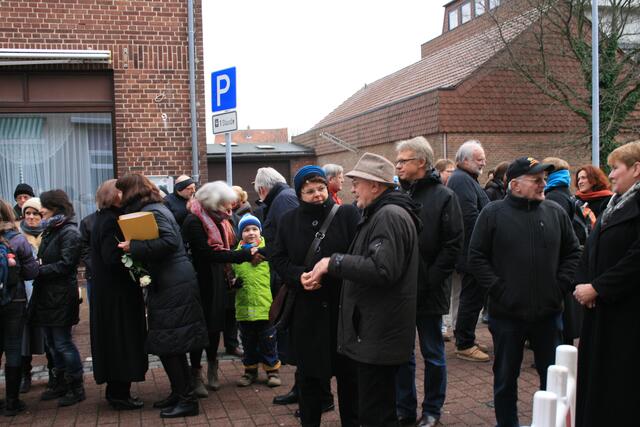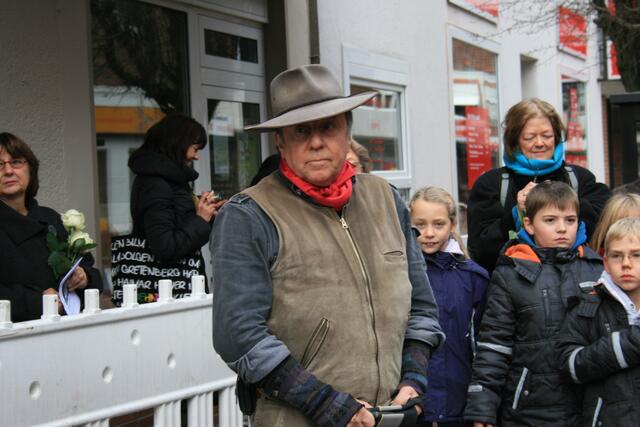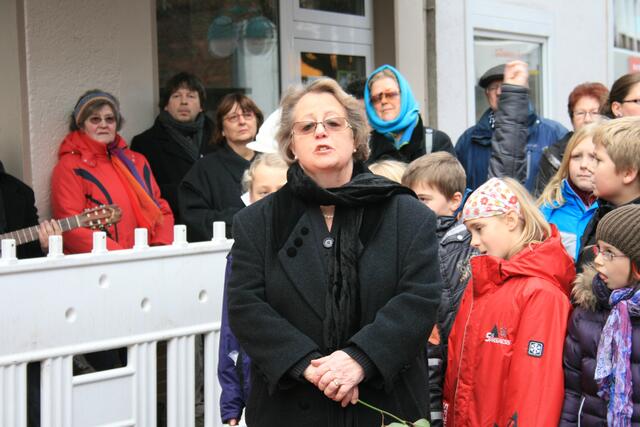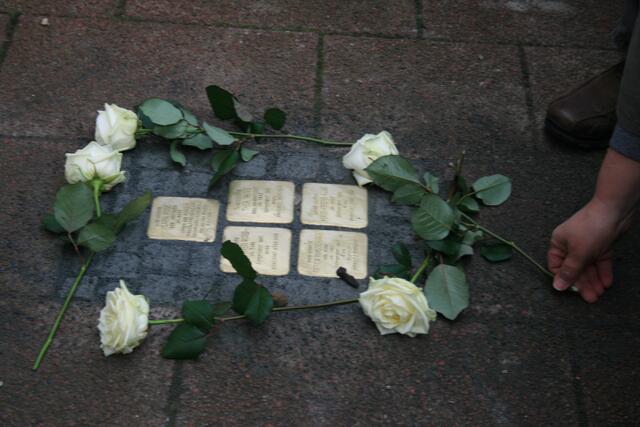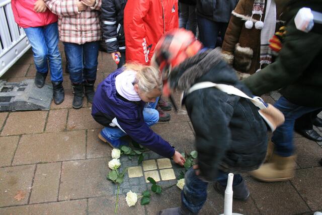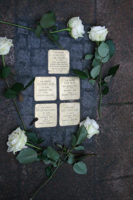 Fünf in der Mittelstraße zum Gedenken der Familie Rose. Regina Runge Beneke hat über das Schicksal der Familie Rose berichtet. Weiterhin sorgten Lehrer der KGS und Schülerinnen und Schüler der Grundschule Breite Straße für die musikalische Untermalung.