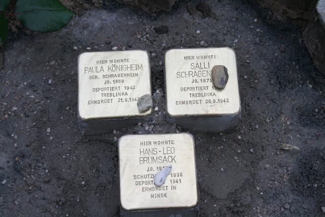 Drei Stolpersteine wurden an der Nordstraße/ Ecke Karl Backhausring, zum Gedenken an die Geschwister Schragenheim/ Königheim und deren Neffen Hans-Leo Brumsack, verlegt.