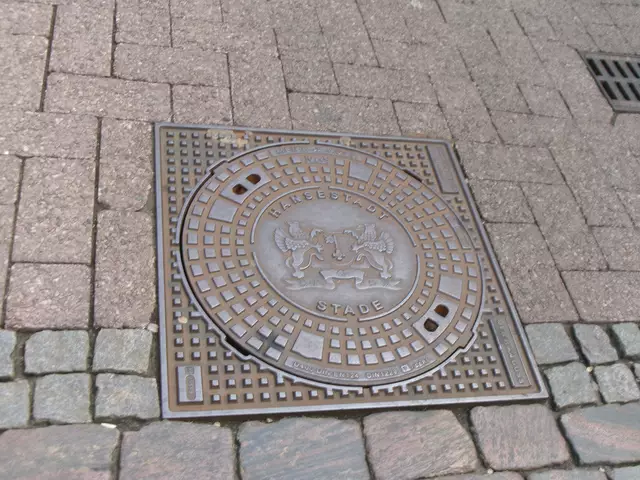 Das Wappen der Hansestadt Stade auf Kanaldeckeln.