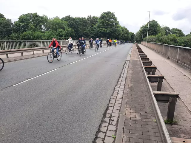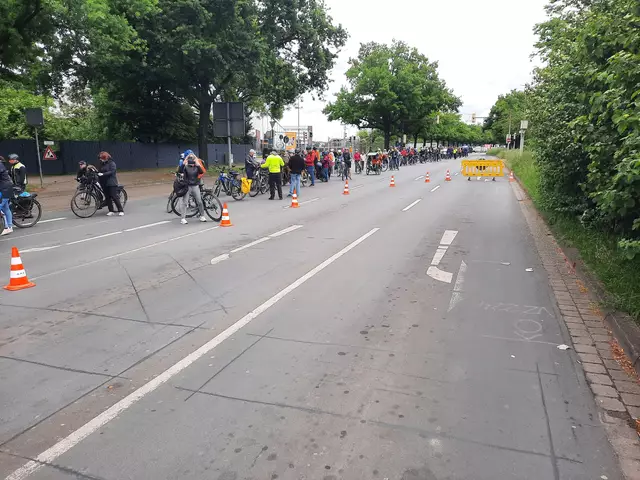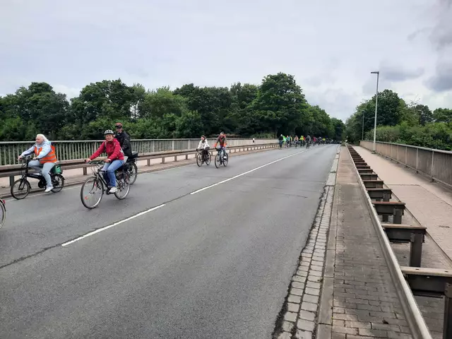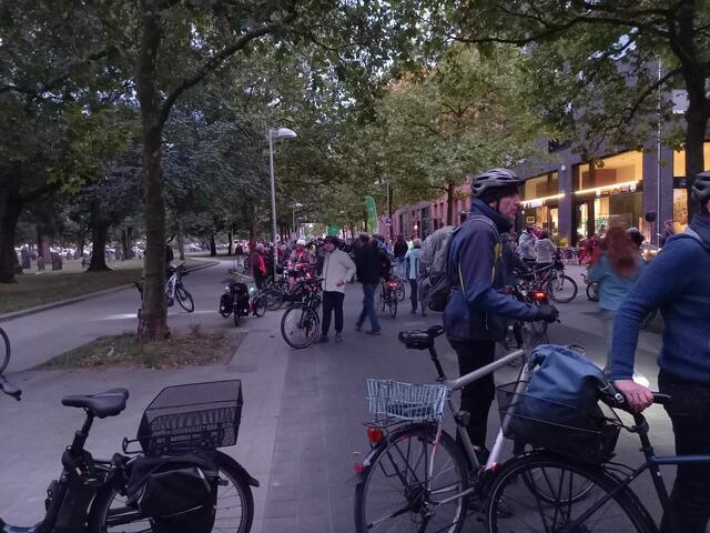 174 Radfahrende aus Langenhagen und aus der Wedemark starteten am Rathaus Langenhagen, und 27 kamen in Vinnhorst dazu. Hier stoppt dieser Tross an der Mecklenheidestraße/Continental, bereit zum Einfädeln in die Radfahrergruppe aus Garbsen, Neustadt, Wunstorf und Seelze. | Foto: ADFC Langenhagen
