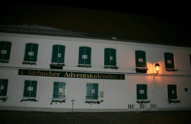 Seit 1969 ist der Aichacher Rathausadventskalender eine große Attraktion! Ab 1. Dezember bis zum Heiligen Abend wird täglich um 17.30 Uhr durch den Nikolaus, alias Leo Hundseder und mit einer helfenden Engelsscharr ein Fenster geöffnet. Die Fensterbilder 2008 wurden von Aichacher Vereinen gestaltet. Nach der Fensteröffnung und dem Rahmenprogramm werden die Kinder mit Süßigkeiten vom Nikolaus versorgt. 1. Dezember: " Aichach in weihnachtlicher Stimmung" Die Köngl. priv. Feuerschützengesellschaft...