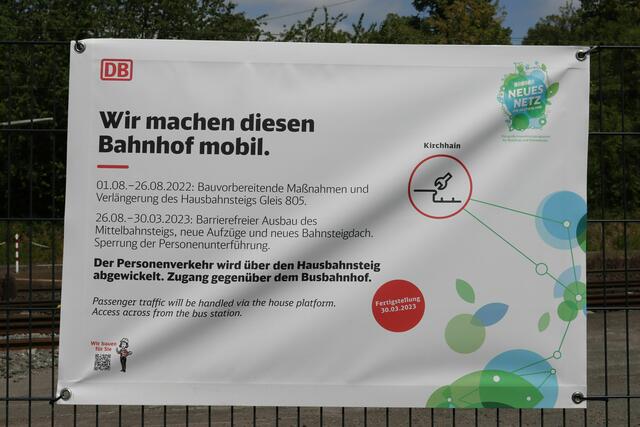 Ab Sommer 2023 wurde der Hauptbahnsteig von Kirchhain erneuert. Am 24.3.2020 um 22 Uhr sollte der umgebaute Bahnsteig wieder in Betrieb sein. Der Bahnhofsumbau von Kirchhain begann mit dem Umbau des sogenannten Hausbahnsteigs, welcher früher einmal zwischen Gleis 5 und 6 lag. Das zweite Gleis war jedoch schon lange verschwunden, sodass Gleis 5 ohne Gleisquerung zugänglich war. Im Jahr 2022 wurde der Bahnsteig zwischen der Straßenbrücke und dem Stellwerk neu gebaut. Der Rest vom alten Bahnsteig...