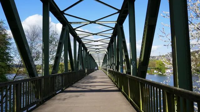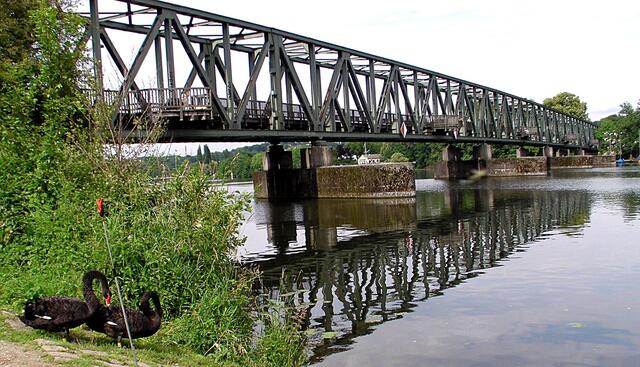 Die Brücke wurde 1872 für die „Bergisch Märkische Eisenbahn“, die so genannte „Ruhrtalbahn“ erbaut. Diese Eisenbahn zweigte am Kupferdreher Bahnhof von der Strecke der ehemaligen Prinz-Wilhelm Einbahn ab, überquerte die Ruhr und verlief oberhalb der Ruhr bis nach Duisburg. Vor dem Bau des Baldeneysees wurde die Brücke umgebaut und erhielt statt der bisherigen Rundbögen die kastenförmige Ausführung. 1945 wurde die Brücke von deutschen Soldaten gesprengt, um den Vormarsch der Alliierten zu...