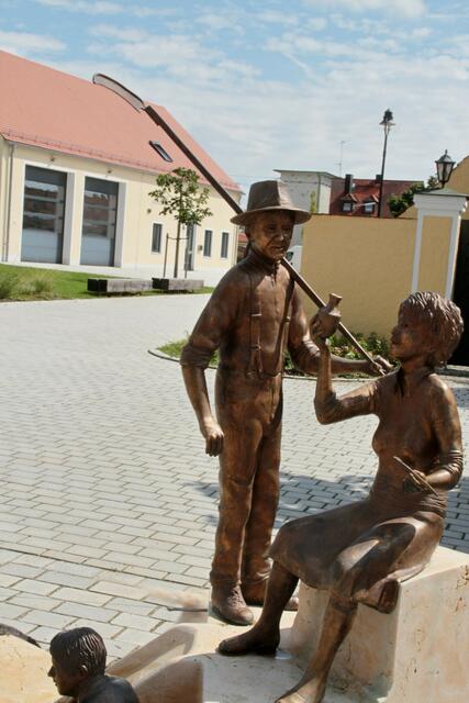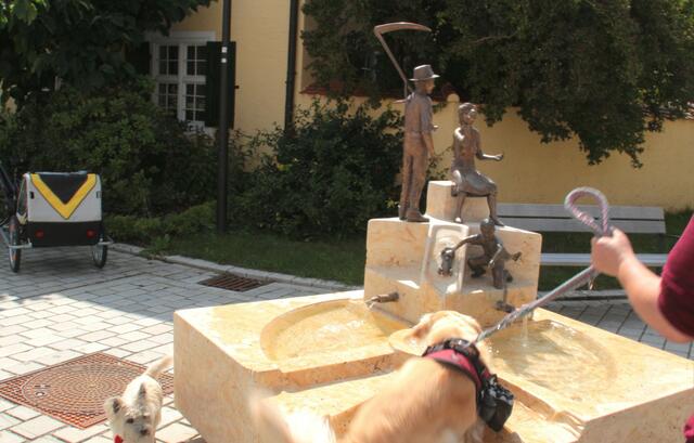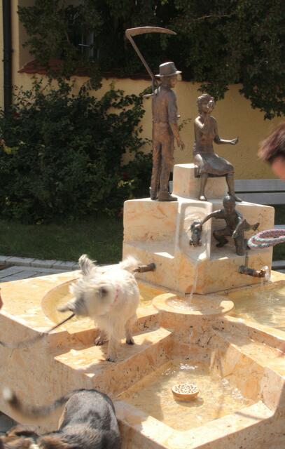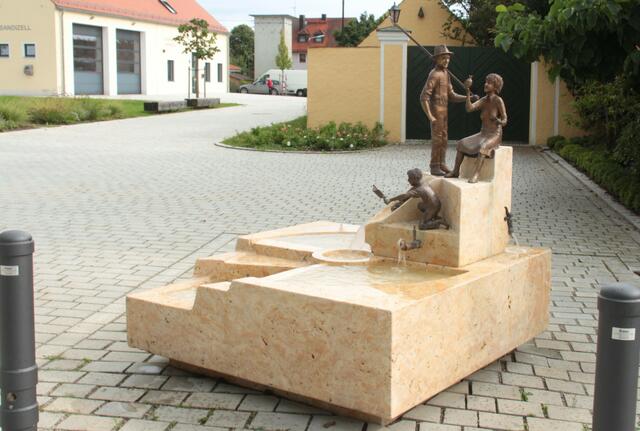 Öffentliche und private Brunnen Zu sehen auf dem Brunnen am Dorfplatz in Sandizell:  Ein Bauer, der eine Porzellanmalerin zuschaut und der junger Graf von  Sandizell als Rennfahrer Weitere Wasserausläufe sind der Stierkopf/Sandizeller Wappen und Sandizeller Spargelkopf Ich konnte einige Hunde sehen und fotografieren die sich bei dieser Hitze am Brunnen abkühlten. Ein Kunstwerk vom Künstler Richard Gruber   Zu sehen am Sandizeller Dorfplatz