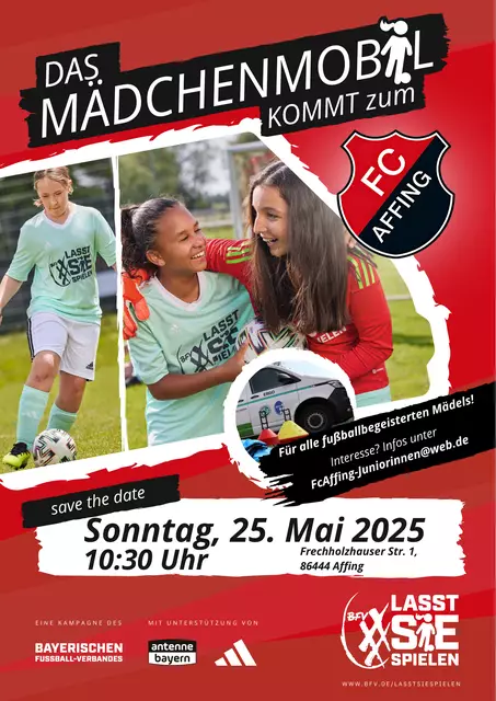 "Wir freuen uns sehr, dass der BFV uns für eine besondere Aktion ausgewählt hat: Am 25. Mai 2025 wird uns das Mädchenmobil besuchen! Im Rahmen der Kampagne #lasstsiespielen unterstützen uns Trainerinnen und Trainer des BFV dabei, interessierten Mädchen die neuesten Trainingsmethoden näherzubringen. Eine tolle Gelegenheit - sowohl für Einsteigerinnen als auch für erfahrene Spielerinnen!", sagt Matthias Geyer, Jugendleiter der Juniorinnen.